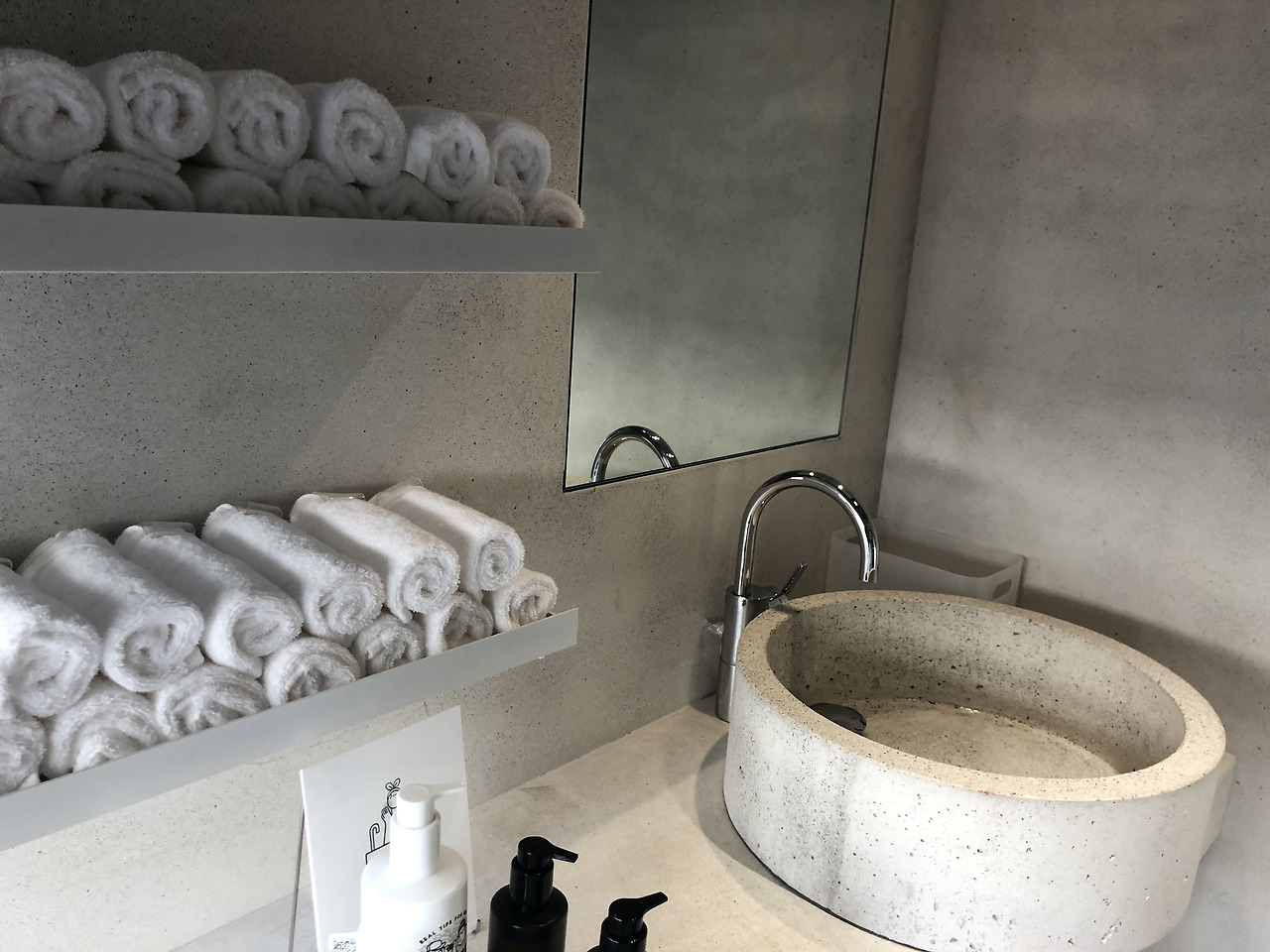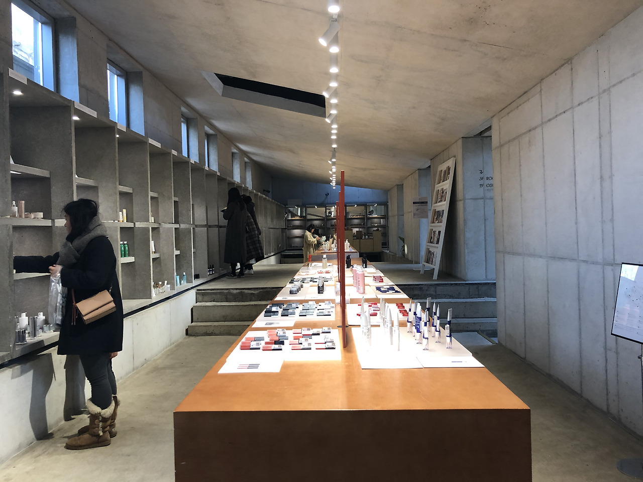 그래서 층고가 오락가락하거나 바닥이 편평하지 않아 계단이 있는 편이다. 자동차를 들어 올리는 호이스트 등의 흔적도 그대로 살아있다. 그러나 반듯한 구조나 깔끔한 벽돌로 마감하여 어느 정도 정제된 느낌이기 때문에 지저분하거나 날것이라는 거부감은 거의 들지 않는다. 코스메틱 브랜드이기 때문에 깔끔한 느낌도 분명 필요한 요소일 것이다.