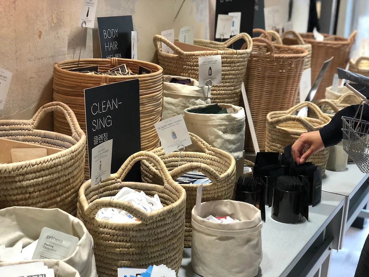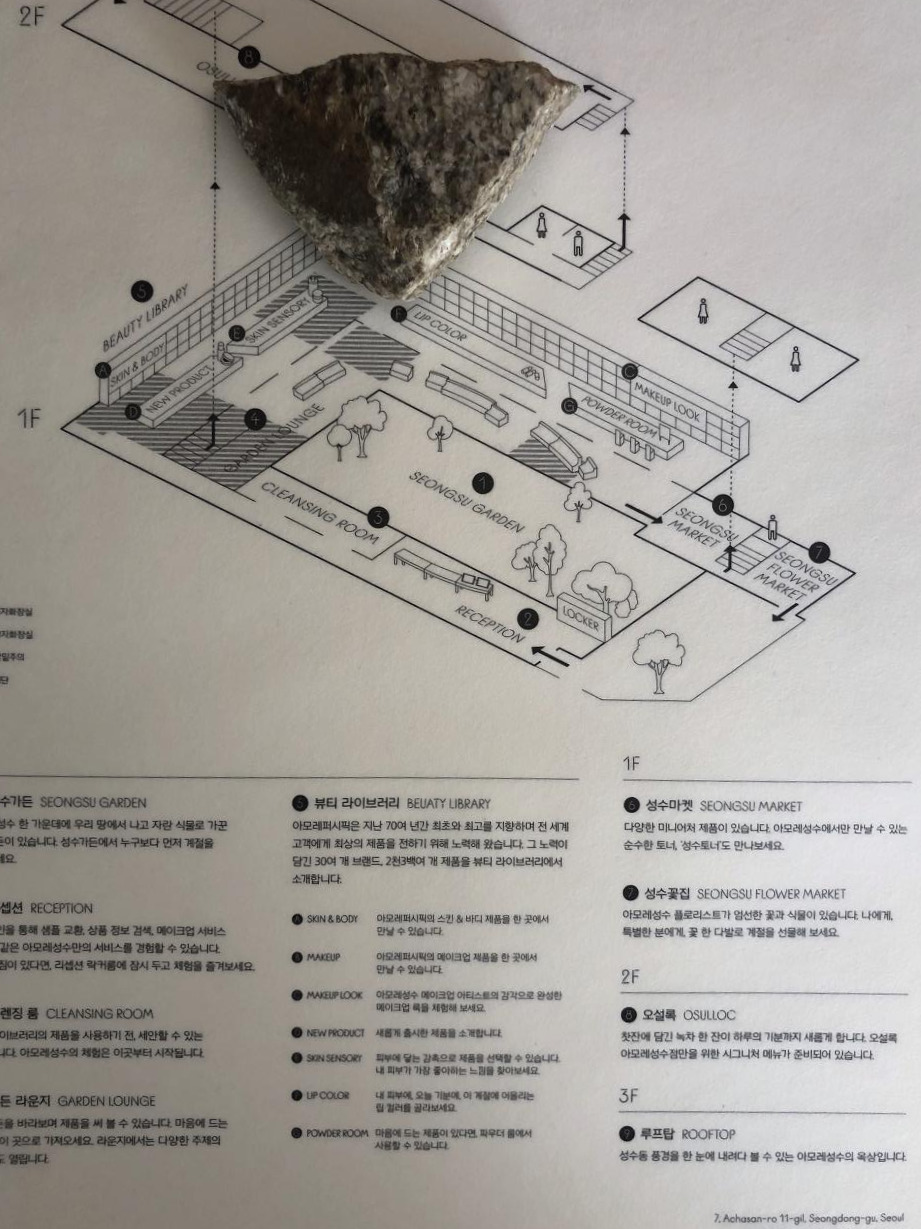 회원가입을 하면 아모레퍼시픽의 APmall 7,000원 상품권, 샘플 교환권, 오설록 20% 쿠폰을 모두 제공한다. 여기서 아모레의 빅 픽쳐를 볼 수 있다. 아모레 성수의 끝까지 다다르면 샘플 존인 '성수마켓'이 있어서 병 샘플 2개, 미니 팩 샘플 3개를 고를 수 있다. 또, 매장의 2층은 오설록이다. 회원가입하고, 실컷 놀며 구경하다가, 무료로 샘플 받아서, 2층에 오설록을 할인받고 마시면 된다. 입구에서부터 고객의 이동 경로가 딱 짜인다.