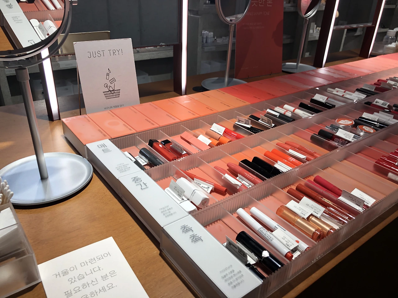 또 인상적이었던 부분 중 하나는 바로 아모레퍼시픽의 브랜드들이 경계 없이 함께 있었다는 것이다. 수많은 브랜드들을 고객에게 강제로 알리기보다는 좀더 와닿는 퍼스널 컬러에 따라 립 제품을 나누고 '매트', '중간', '촉촉'이라는 직관적인 워딩으로 분류해두었다. 립 제품은 지우기도 편하고 금방 눈에 띄어서 가장 발라보기 쉬운 제품이다. 그래서 드러그 스토어에서도 색조 제품을 가장 앞에 비치한다고 하지 않는가. 립 제품 매대는 안쪽 공간의 큰 부분을 차지한다.