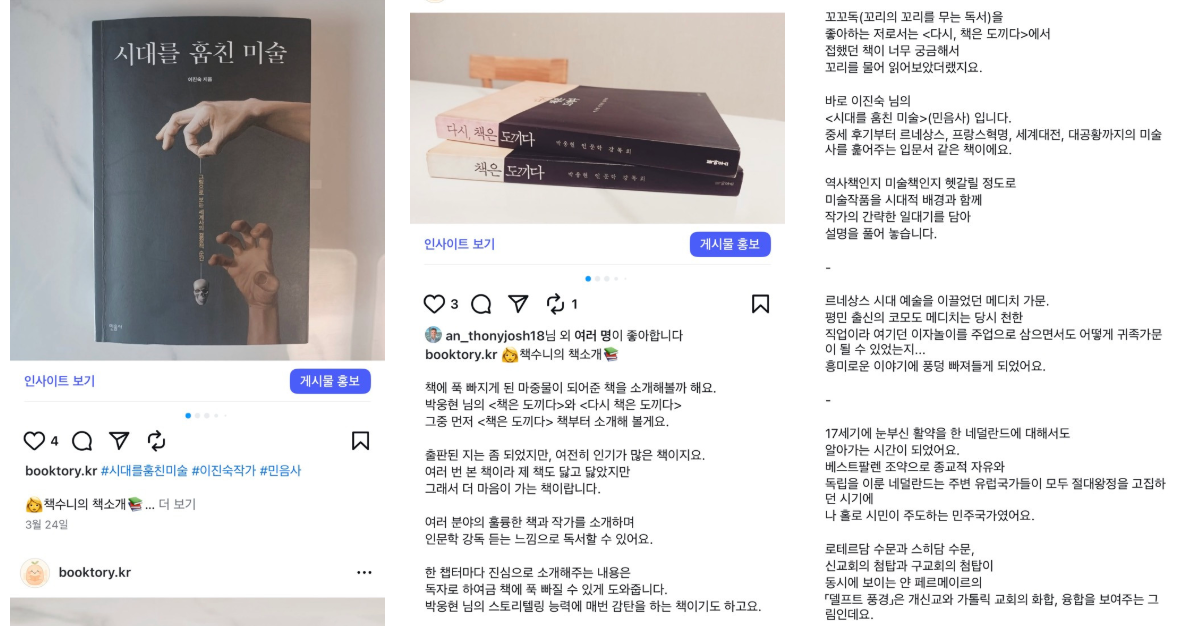 내 눈에 들어온 것은 흑백사진보다도 못한 초저화질의 구닥다리 사진이었다. 천장 조명의 그림자가 그대로 비친 책 사진과 구구절절 독후감 같은 책 리뷰가 가시처럼 밟혔다. 싸이월드가 부활해도 안 받아줄 것 같은 내 사진과 글을 보며 정신이 번쩍 들었다.