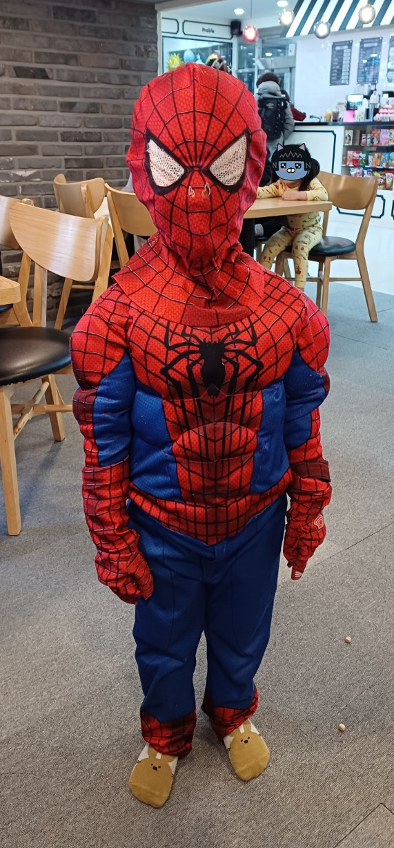 예상대로 너무나 좋아한다. 한동안을 깔깔대며 웃고 스파이더맨으로 빙의해서 집에서 온갖 악당들을 물리치며 진심을 다해 놀이를 했다. 외출복이 될 만큼 외출할 때나 집에서나 언제나 스파이더맨 옷을 입고 다녔다. 이 스파이더맨 코스튬은 덩치가 커 보이도록 하기 위해 울끈불끈 근육 솜이 붙어있다.
