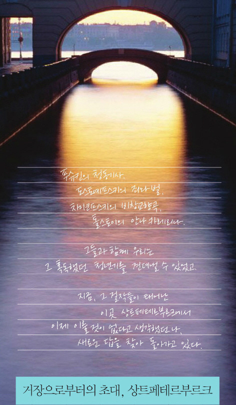 푸슈킨의 청동기사, 도스토예프스키의 죄와 벌, 차이코프스키의 비창교향곡, 톨스토의의 안나 카레리나.. 그들과 함께 우리는 그 혹독했던 청년기를 견뎌낼 수 있었고, 지금, 그 걸작들이 태어난 이곳 상트페테르..