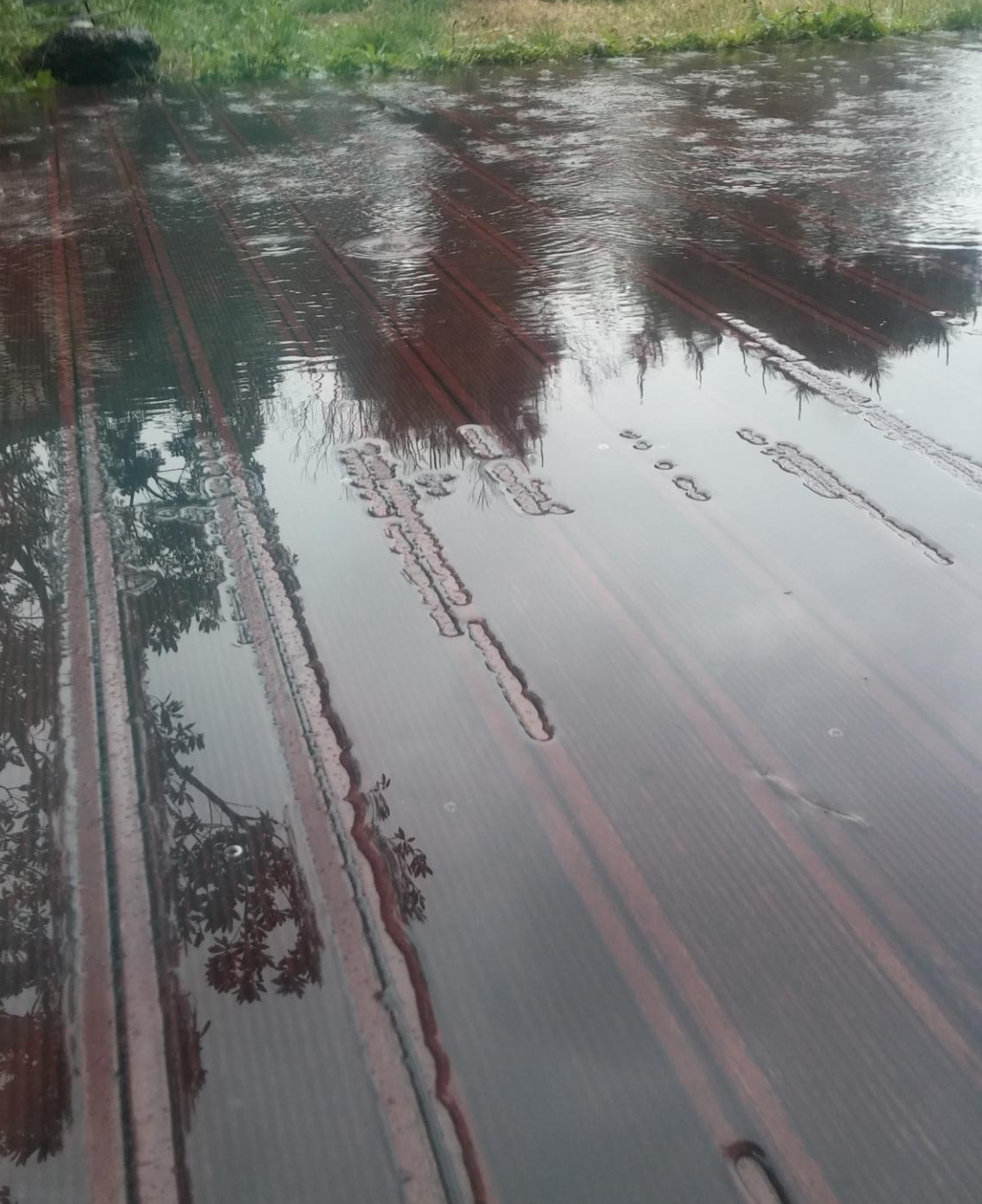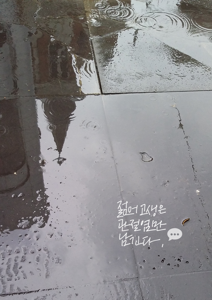 비가 내린 날 소소한 풍경, 커피숍 데크와 버스정류소 뒤 고인물..