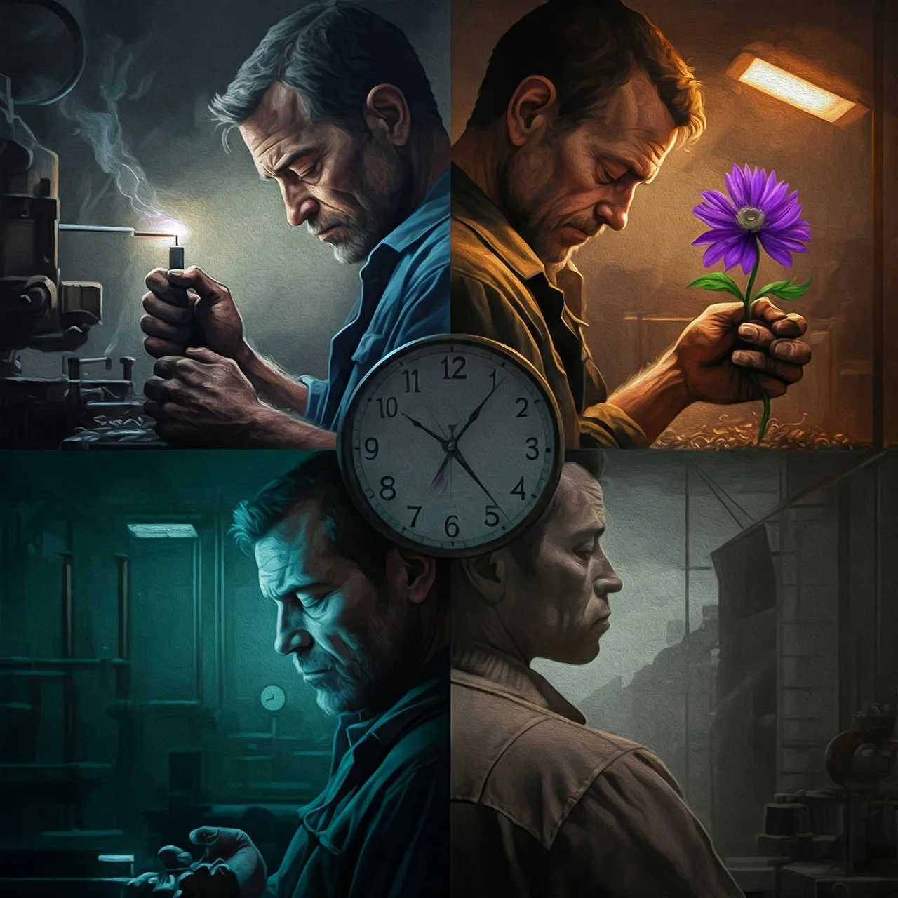 {구부정한 뒷모습 = 책임감³ + 숨겨진 눈물 - 가족의 미소}