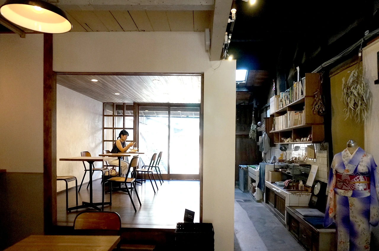 이또노와는 약 10년간 방치되어 있던 마찌야 두 채(각 약 100㎡)를 중정을 중심으로 연결해, 약 33m 길이의 선형 공간으로 재구성한 사례다. 남북으로 이어진 두 개의 골목에 접한 부지는 동쪽에 카페 출입구, 서쪽에 주출입구를 두어 하나의 대지 안에서 두 골목을 잇는다. 내부 프리 스페이스는 신발을 벗고 이용하도록 구성되어 있어, 완전한 통과형이라기보다 두 골목을 연결하는 매개 공간에 가깝다.