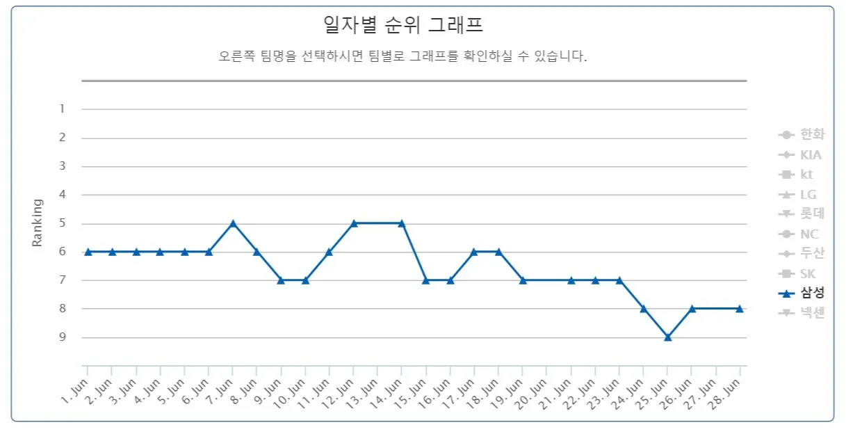 옛말에 부자는 망해도 3년은 간다고 했다. 하지만 삼성의 경우에는 그 말이 거짓임을 증명하는데 한 달, 아니 보름이면 충분했다. 6월 한 달간 쌓은 승수는 총 7승. 그래도 5할 승률에서 왔다 갔다 하면서 반등의 기회를 노려보나 했지만 지금은 승패마진이 -11이다. 5할 언저리에서 5위가 결정된다고 봤을 때, 전반기가 끝나가는 이 시점에서 쉽지 않은 수치인 것 같다. 언제 삼성이 가을야구를 걱정한 적이 있었던가. 초반에 성적이 좋지 않았어도 여름성이라 불리며 귀신같이 1위를 차지하던 게 불과 일 년 전이다. 멍게 강점기 시절, 09년 5위 이후로 가을에 야구를 못할 것 같다. 올해는 정말 1도 기대가 안된다!