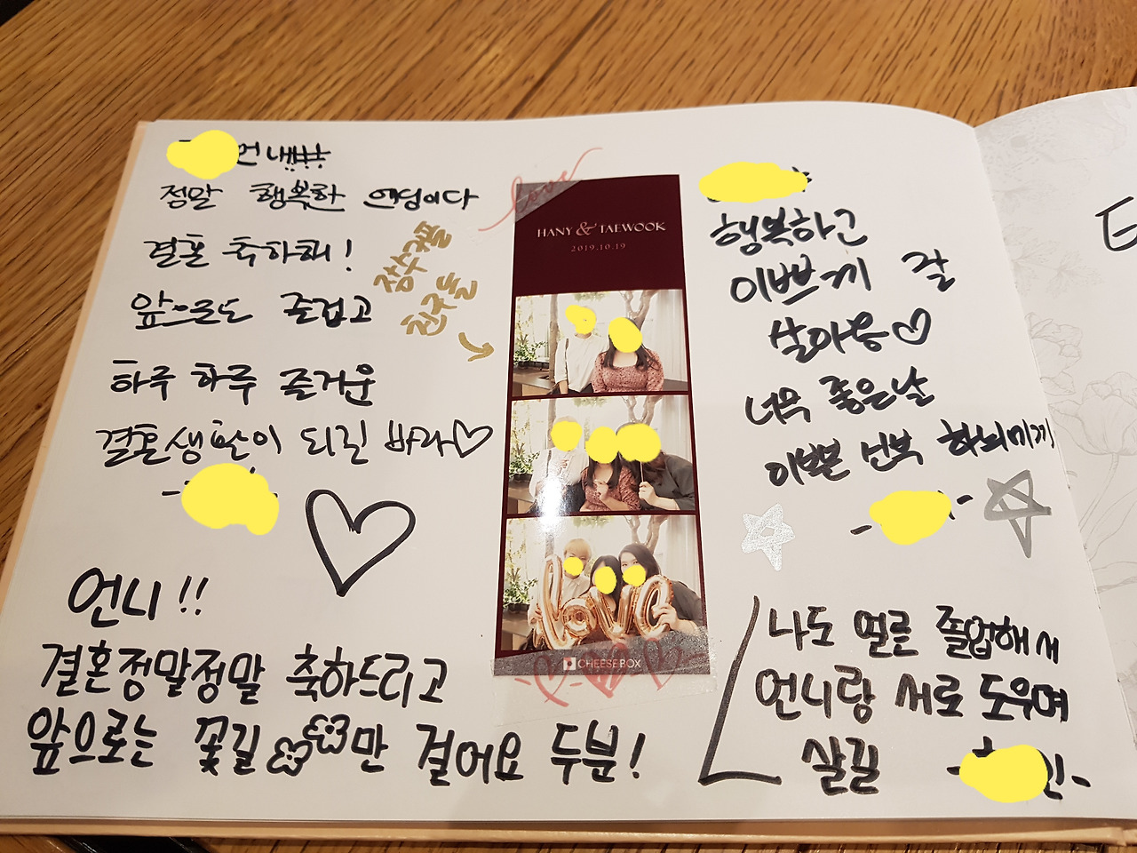 예식장 스티커 포토 부스인 치즈 박스는 예식장에 온 하객들의 사진을 찍어주고 포토 방명록을 만들어 주는 서비스이다.스티커 사진을 2장을 찍어서 1장은 하객들이 갖고, 나머지 한장은 포토 방명록에 붙여서 신랑 신부에게 메시지를 남길 수 있다.