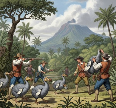 그러나 도도새의 평화는 인간의 만남과 함께 곧 깨지고 말았습니다. 16세기 후반, 네덜란드 선원들이 모리셔스 섬에 처음 발을 디뎠습니다. 그들은 처음 보는 이상한 새를 발견하고 깜짝 놀랐습니다. 이 새는 사람을 봐도 전혀 도망가지 않았기 때문입니다. 선원들이 손을 뻗어 만져도, 심지어 때려도 도망치려 하지 않았습니다. 도도새가 겁이 없었던 이유는 아주 단순했습니다. 자연 속에서 살면서 인간과 같은 무서운 존재를 만나본 적이 없었던 것입니다. 도도새의 이런 행동은 마치 ‘천사처럼 순진하다’는 느낌을 주었지만, 이 순진함은 곧 큰 비극으로 이어졌습니다.