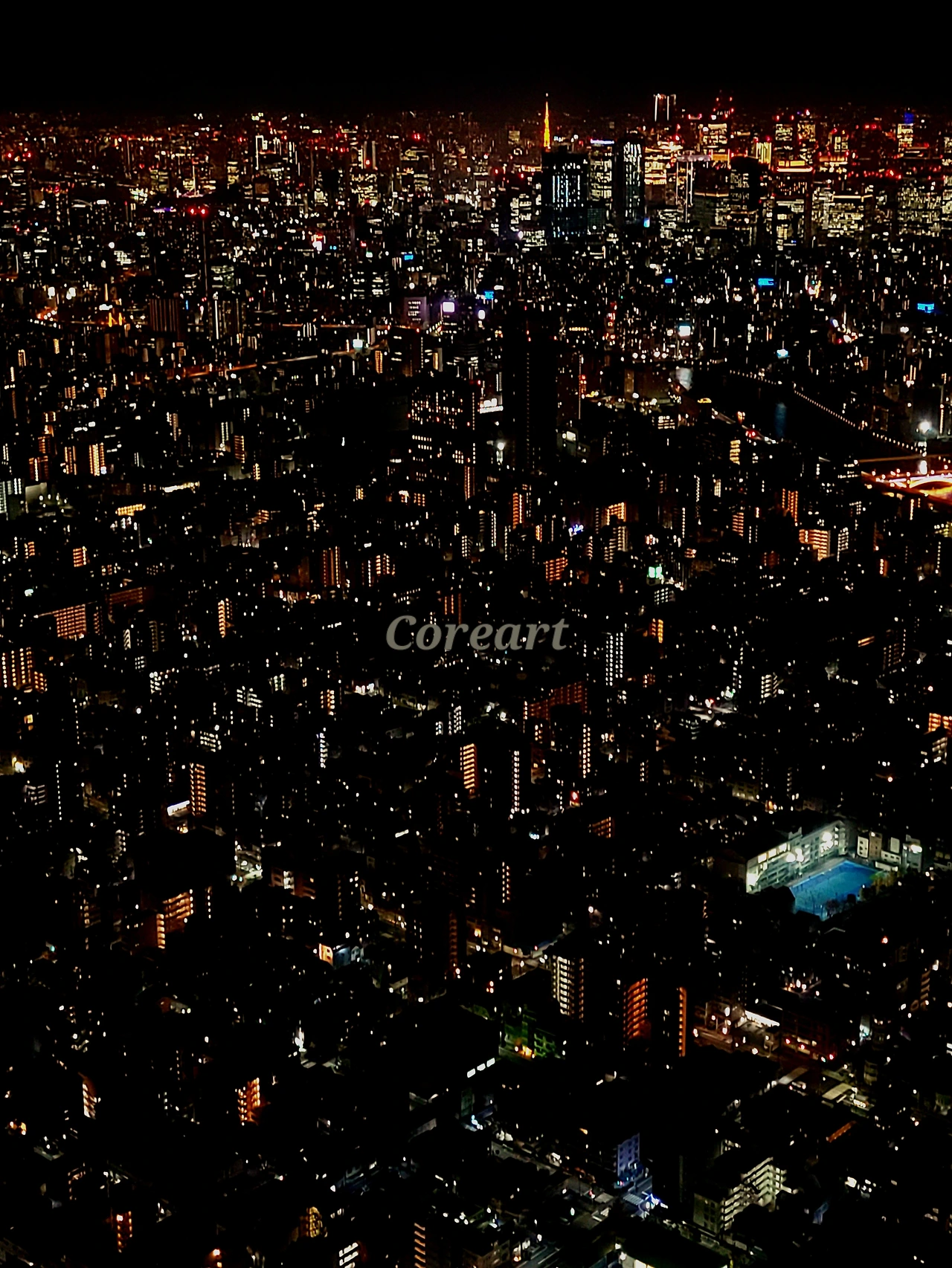 전파탑인 스카이트리 위에서 바라본 도쿄의 야경. 도심은 지평선과 맞닿는 구간으로 넓게 펼쳐졌다. 같은 장소더라도 그것을 바라보는 높이에 따라 다른 인상을 준다.