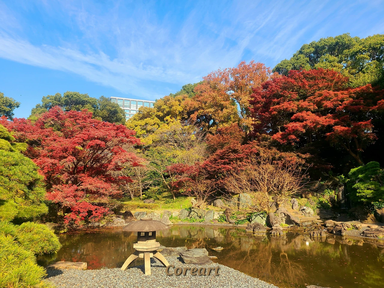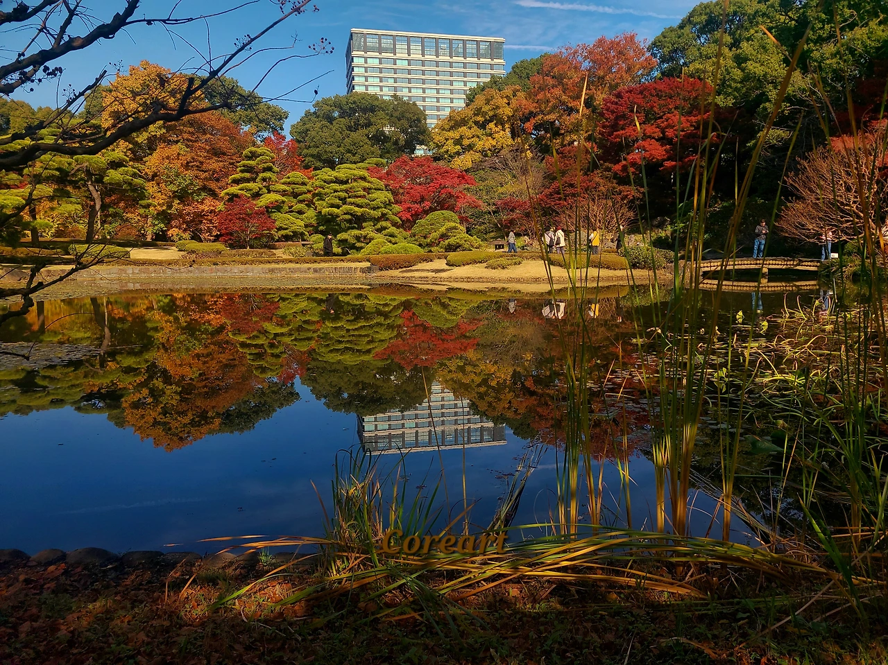 도쿄 도심의 건물숲을 지나쳐 도착한 고쿄 히가시 교엔의 연못가. 연못을 바라보자, 물 위에 거울처럼 비친 단풍과 건물의 풍경.