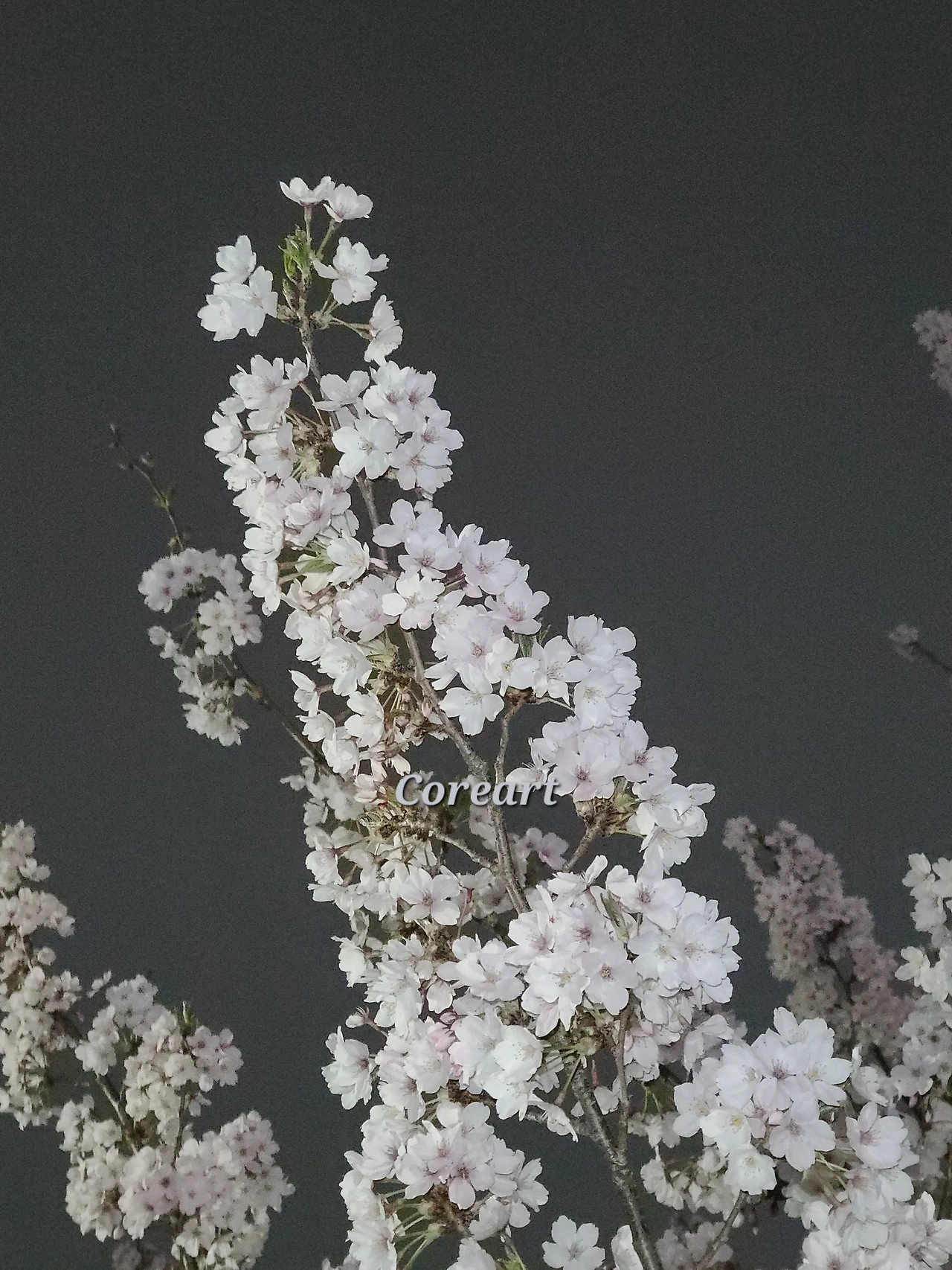가까이서 보면 빗물이 아침이슬처럼 맺힌 벚꽃의 꽃송이. 탁한 먹색의 밤하늘 아래, 하얀 벚꽃이 활짝 피어 있었다. 먹구름과 벚꽃의 색상 대비가 은근히 조화롭다. 왠지 모르게 흰 벚꽃이 더욱 아련하게 느껴졌다.