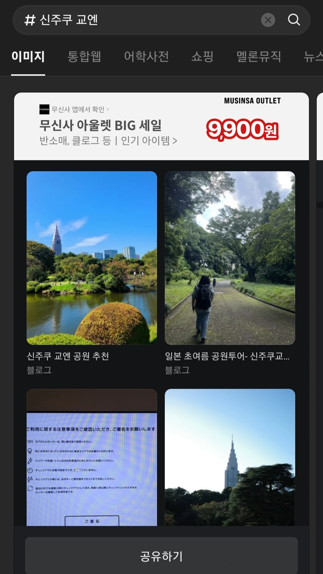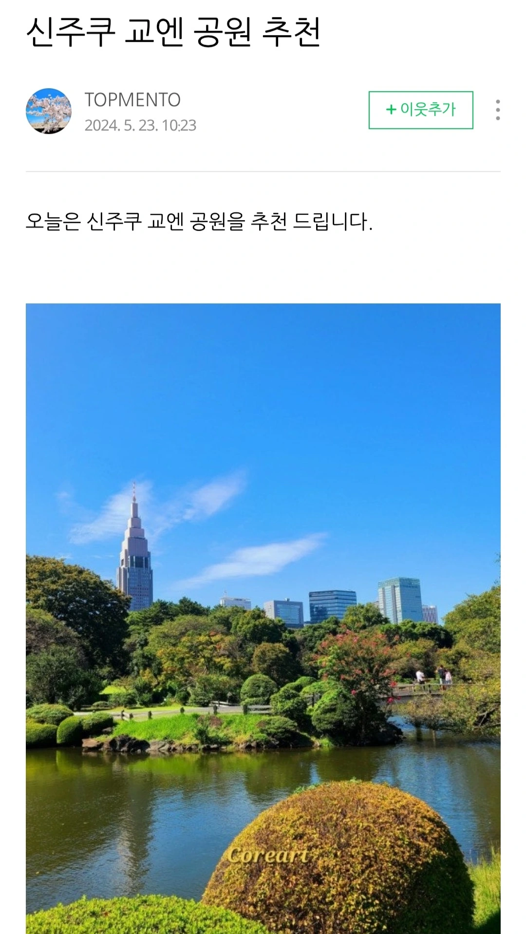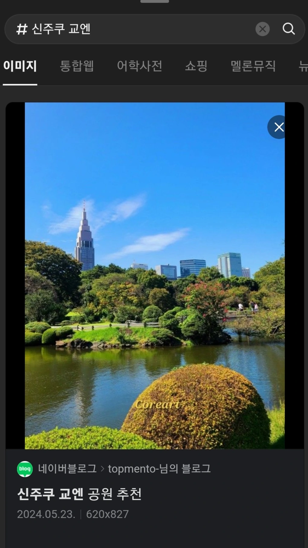 글을 올리고 몇 개월 시간이 지난 뒤, 카카오에서 신주쿠 교엔을 검색해 보았다. 검색 결과, 올렸던 사진들 중 여행지의 전경을 담은 사진 한 장이 최상단에 떠있었다. 기쁜 마음에 곧장 이미지를 클릭하였다.