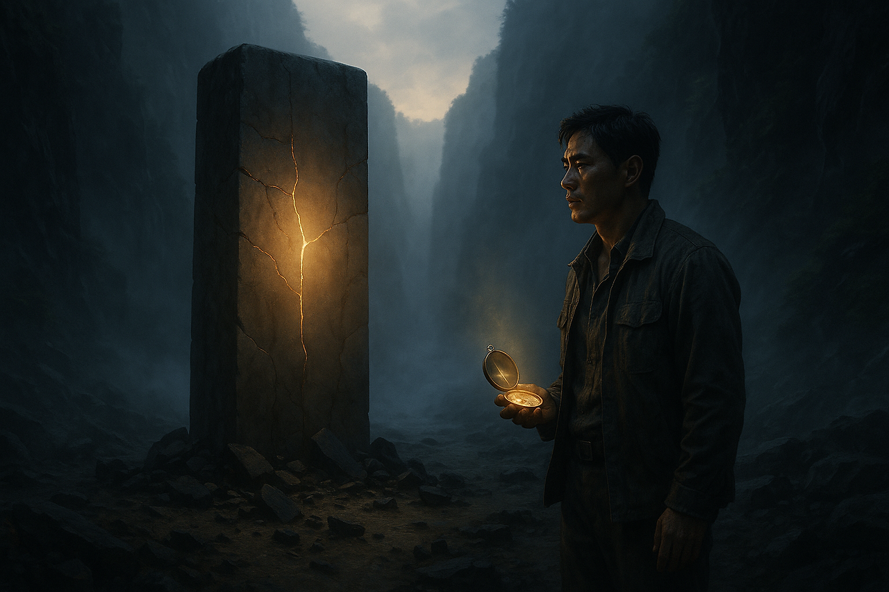 이를 악물자, 그의 가슴속에서 작은 빛이 피어나는 것을 느꼈다. 그것은 그가 수많은 이들에게 전했던 ‘끈기’와 ‘새로운 시작’에 대한 믿음이었다. 그 빛이 그의 손바닥에서 서서히 형체를 갖추기 시작했다. 작은 나침반 모양의 결정체였다. 바늘은 맹렬하게 흔들렸지만, 그가 나아가야 할 방향을 희미하게 가리키고 있었다.