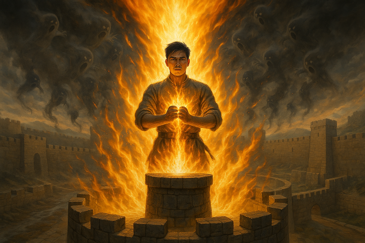 그의 몸에서 뿜어져 나온 빛이 ‘용기의 불씨’와 결합하자, 불씨는 순식간에 거대한 불꽃으로 타올랐다. 불꽃은 마치 거대한 방벽처럼 하오빛과 망루를 감쌌다. ‘소심함의 벽령’들이 불꽃에 닿자, 그들은 비명을 지르며 연기처럼 사라졌다. 그들의 본질인 ‘망설임’이 ‘용기’의 뜨거움 앞에 녹아내리는 순간이었다.