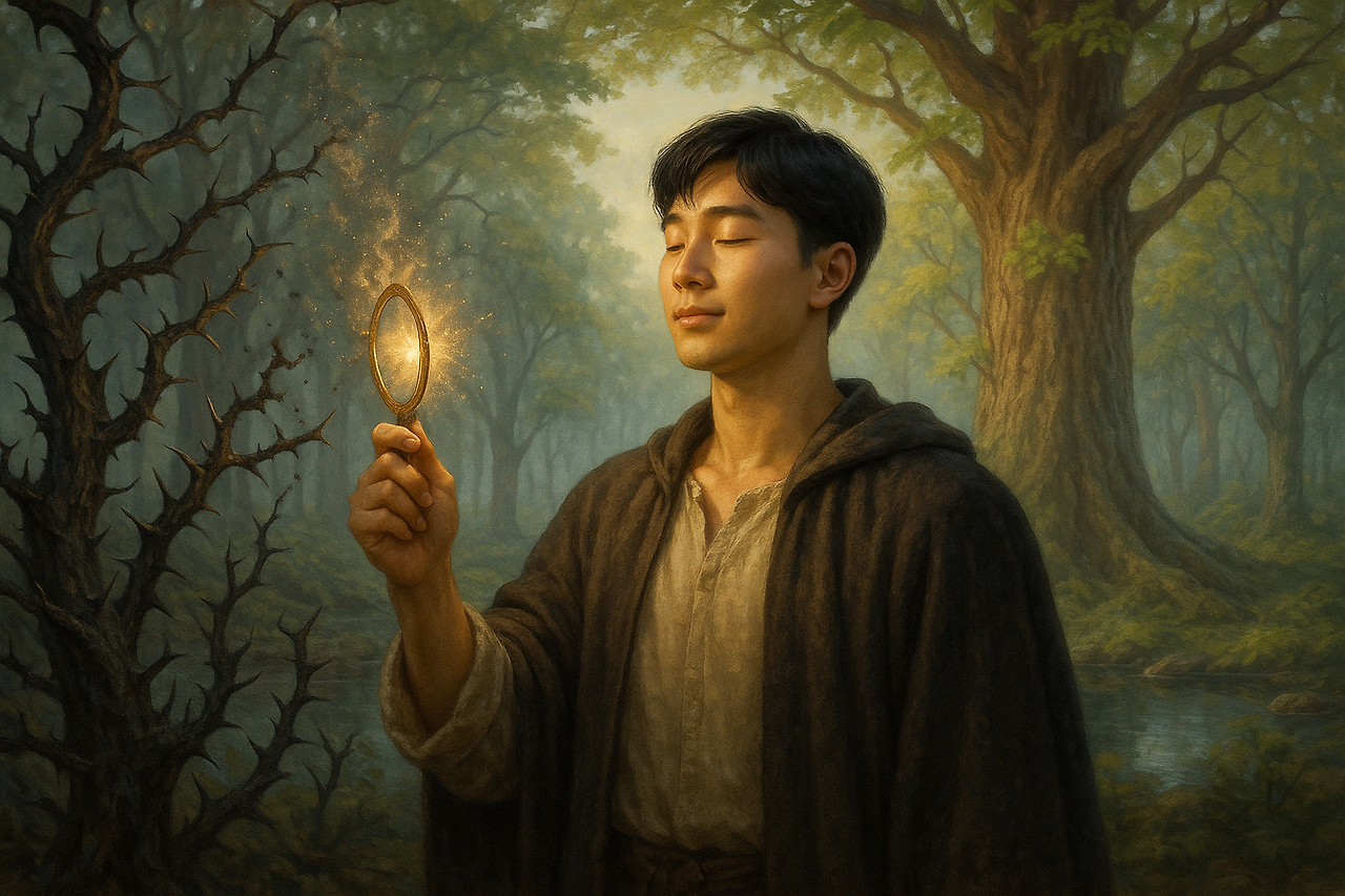 그는 ‘진정한 거울’을 ‘자존감의 나무’에 가까이 가져갔다. 거울의 빛이 고목에 닿자, 고목은 순식간에 생명력을 되찾으며 푸른 잎이 돋아나기 시작했다. 뒤틀렸던 나뭇가지들도 올바르게 펴지며 하늘을 향해 곧게 뻗어나갔다. 숲을 뒤덮었던 ‘시기심의 덩굴손’들은 완전히 사라지고, 연못의 물은 맑고 투명하게 변했다. 숲 전체에서는 더 이상 ‘비교의 속삭임’이 들리지 않았다. 대신, ‘나는 나로서 충분해!’, ‘나는 소중하다!’ 하는 긍정적인 자기 확신의 속삭임이 울려 퍼지는 듯했다.