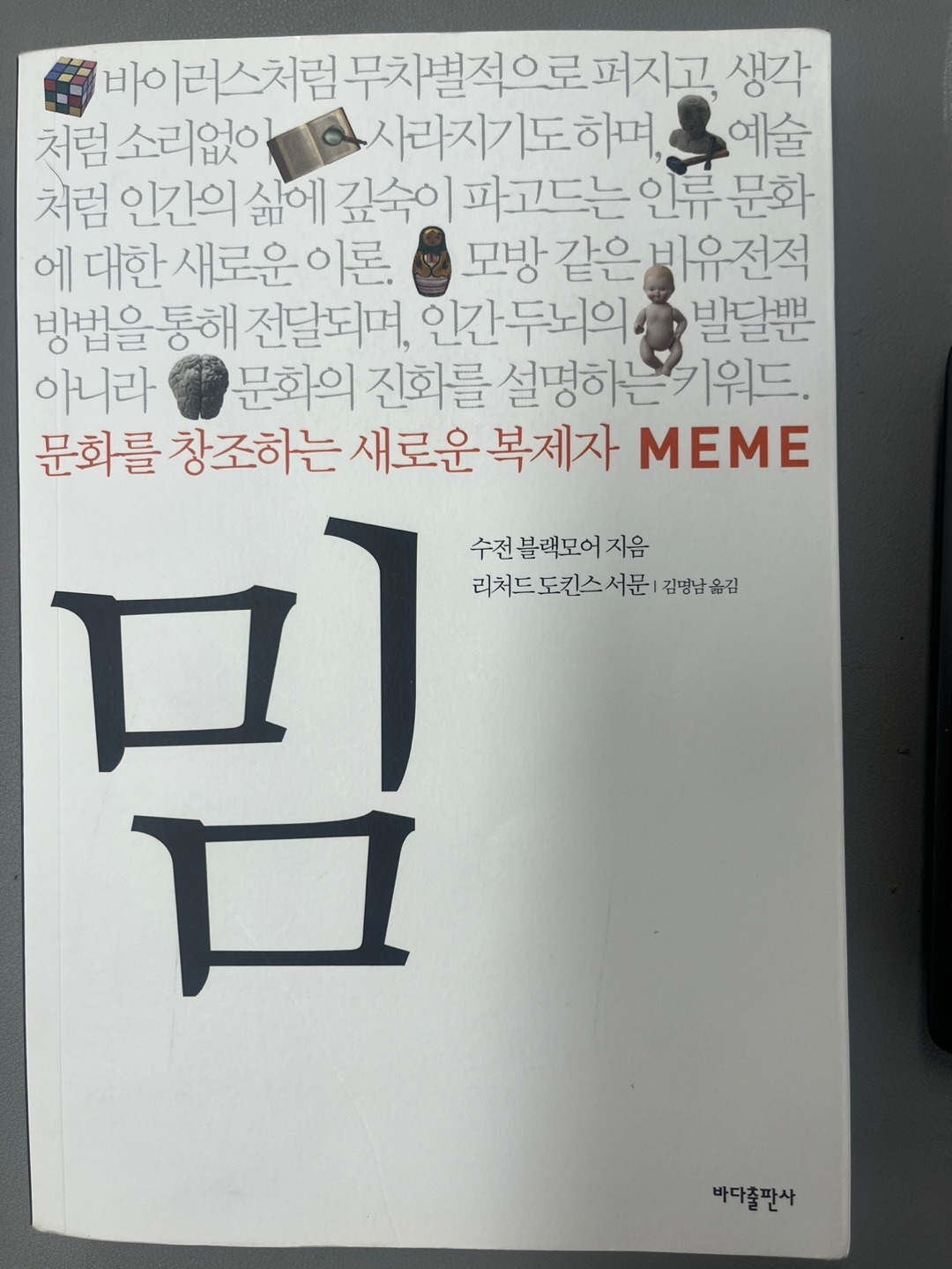 으로 설정한다는 부분에서는 많은 공감을 했다. 리처드 도킨스는 이기적 유전자, 즉 인간은 유전자를 전달하는 기계라고 말했다. 그러나 인간은 지식을 전달하는 기계라고 말하는 것과 비슷하다. 어쩌면 인간은 요즘 뜨고 있는 ‘밈’이라는 것을 전달하는 기계일지도 모르겠다. 지금 밈이라는 책을 읽고 있다. 이 책도 리처드 도킨스가 서문을 썼다.