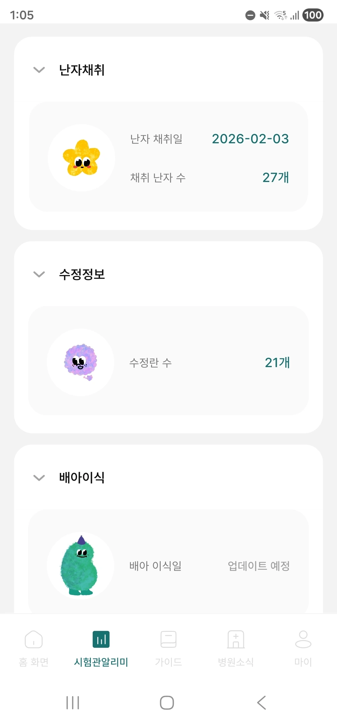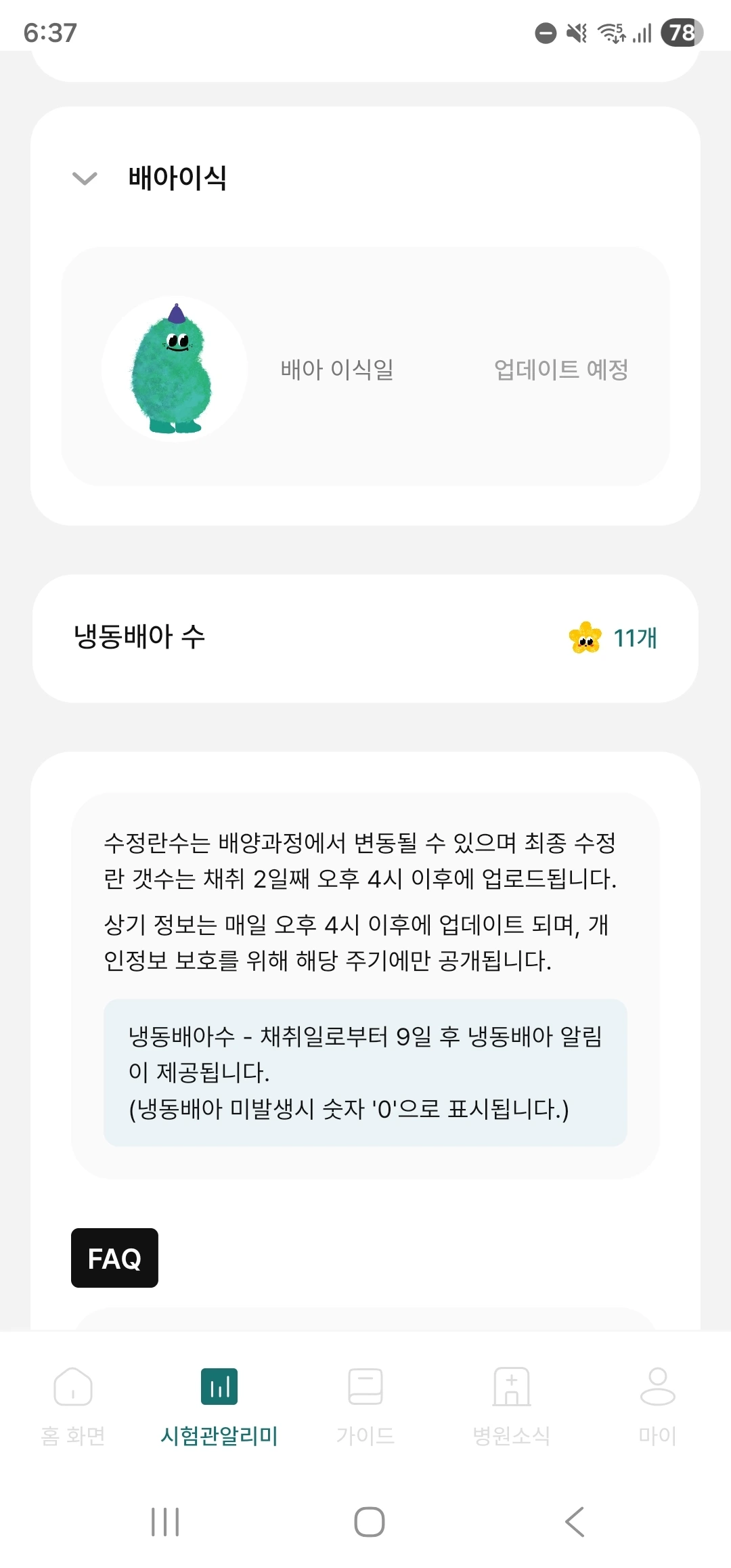 그리고 어플을 확인하니 냉동배아개수가 11개라고 업데이트되었습니다. 몇 번은 이식을 시도할 수 있을 것 같아서 다행입니다. 생리가 터지면 병원에 방문하라고 하셨으니 이제 편안한 마음으로 일상생활을 해야겠어요.