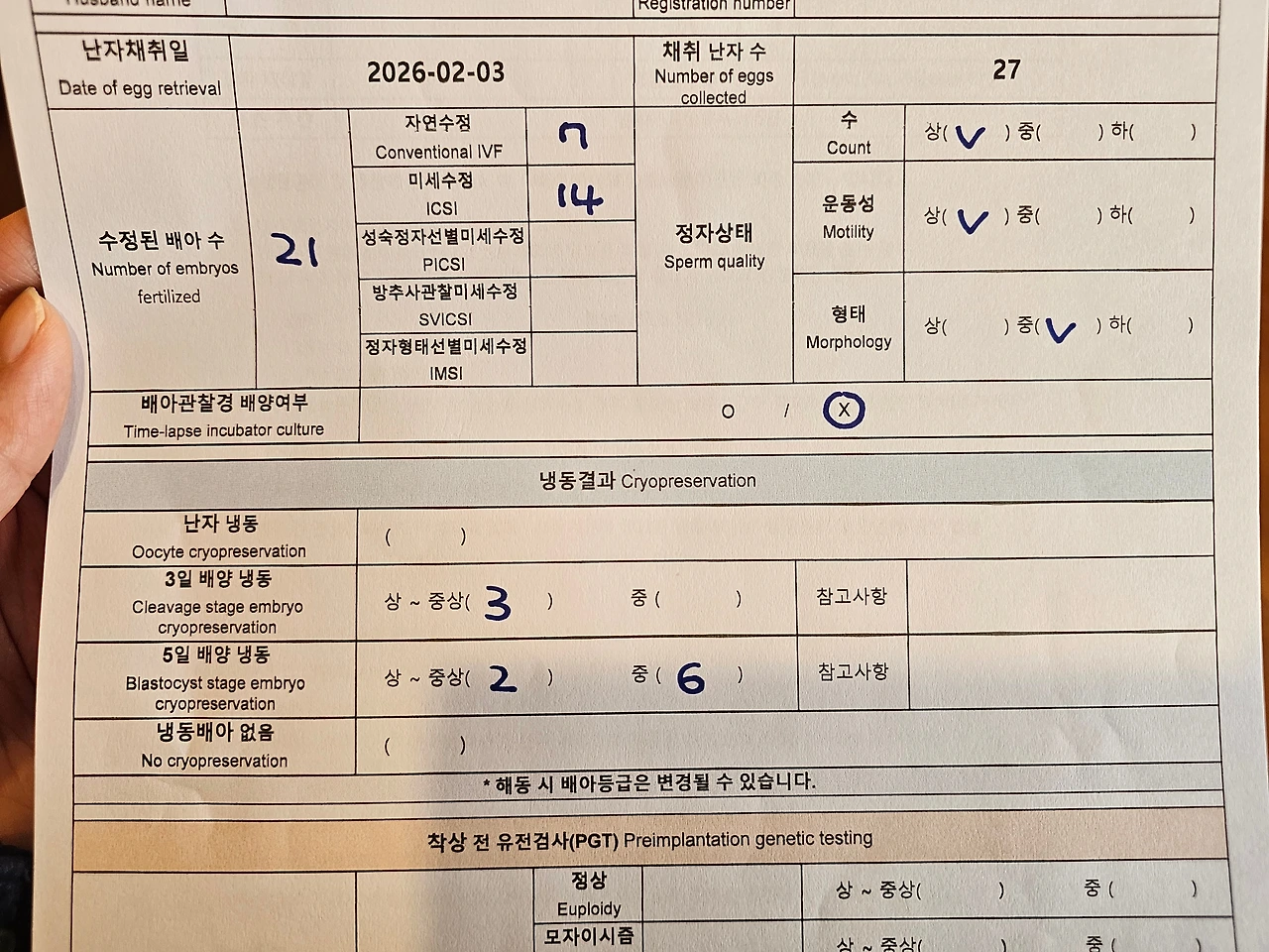 초음파 본 후에 배아등급 알려주셨는데 5일 배아 상급이 2개나 나왔다고 좋은 거라고 하셔서 기분이 좋았어요.