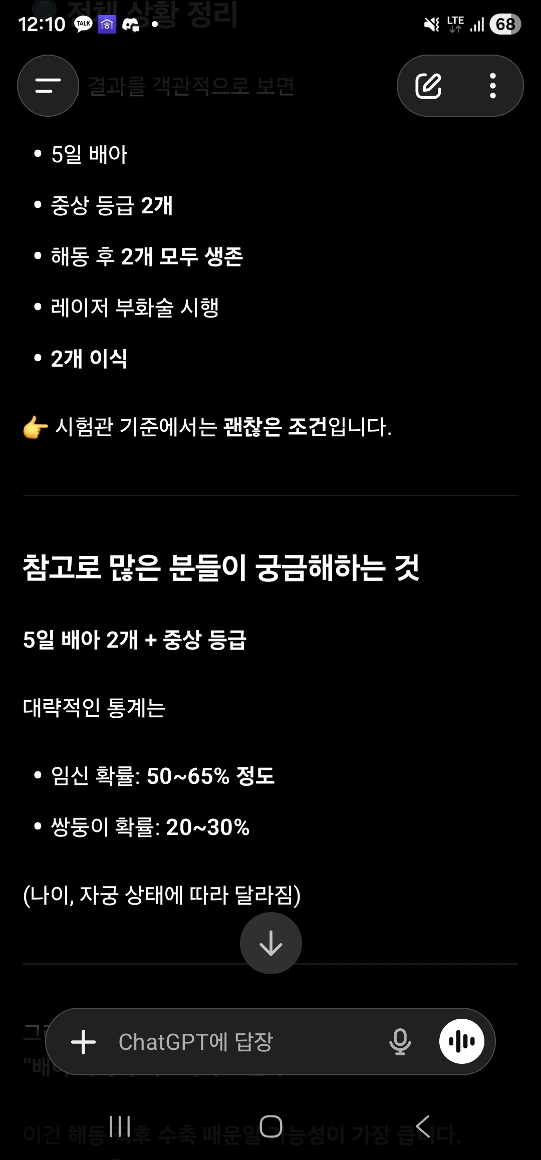 정확한 결과는 시술 후 9일 뒤에 피검사 일정이니 그때 결과를 알 수 있을 것 같아요.