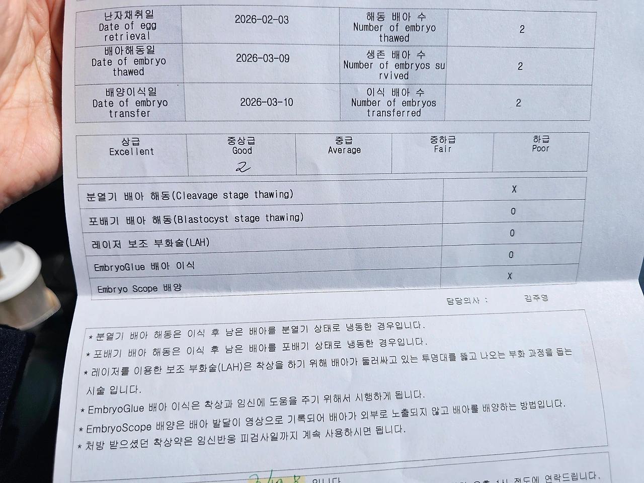 임신확률은 50프로 정도고, 2-3일간은 절대 안정하라고 하셨어요. 저도 모르게 담당선생님 손을 계속 꼭 잡게 되더라고요. 너무 친절하셔서 감사했어요.
