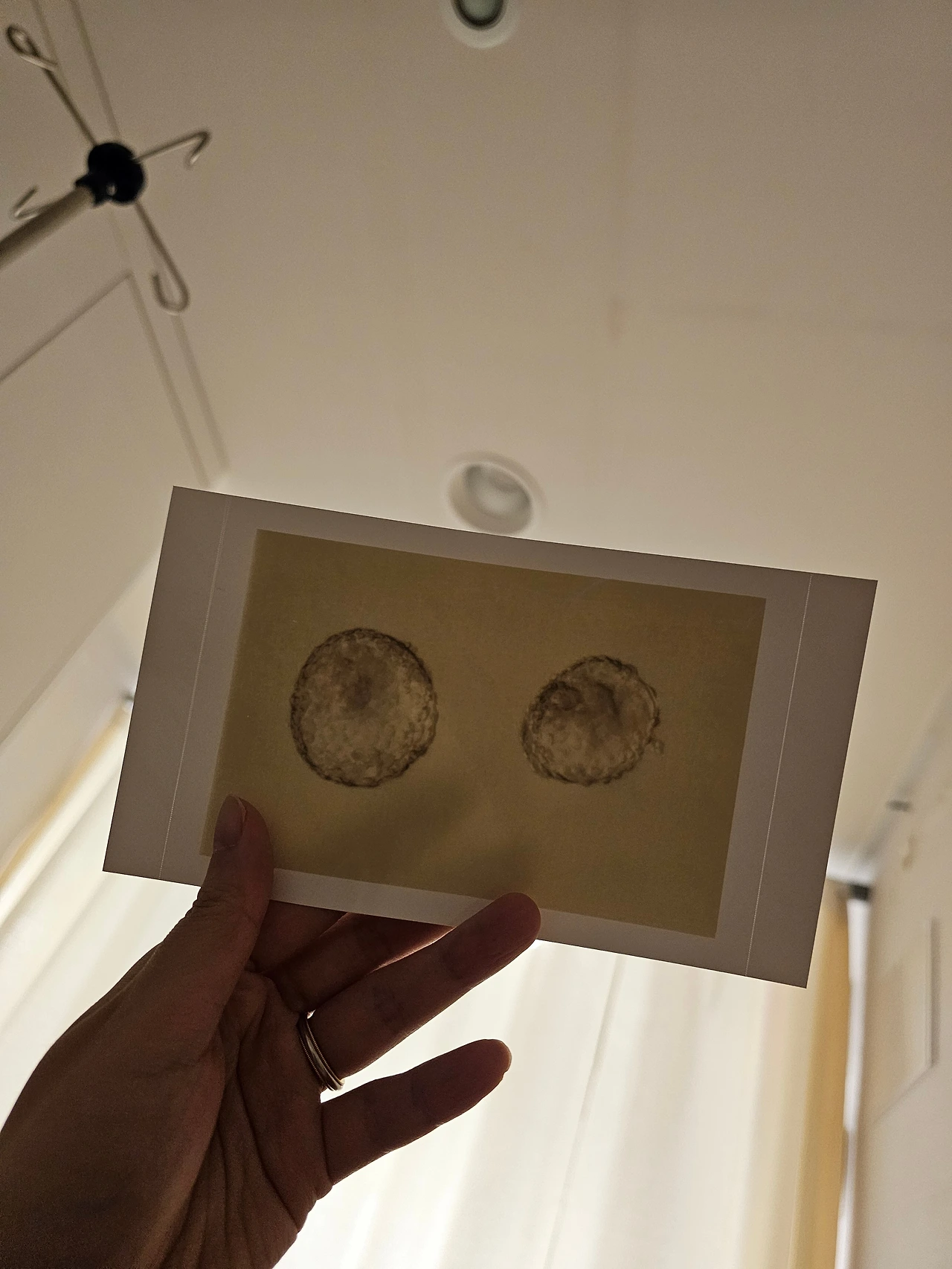 시술은 인공수정 때처럼 금방 끝났어요. 그리고 이식한 배아 사진을 주셨어요. 배아를 실제로 보니 너무 신기했어요. 이게 자라서 아기가 되는거구나.. 그런데 하나는 동그란데 다른 한 개의 모양이 찌그러져있어서 걱정되어 여쭤봤더니 냉동배아라 해동되어서 저렇게 찍힌 거지 금방 돌아오는 거라고 중상급이라 좋은 배아라고 말씀해 주셨어요.