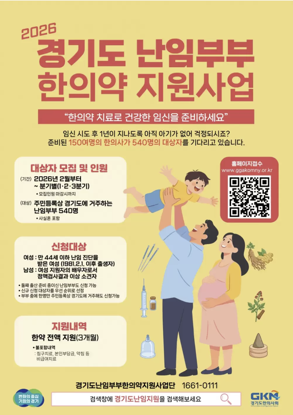홈페이지에 들어가서 확인해 보니 3개월간 한의학으로 난임치료를 받는 과정이고 한약 비용을 지원, 침구치료나 약침 등 본인부담금+비급여는 개인부담이었어요. 지원사업을 신청하면 심사를 통해 일부 선정하여 지원해 주는 거고 한방 치료를 받는 동안 인공수정, 시험관 등 시술은 중단하는 기준이었어요.