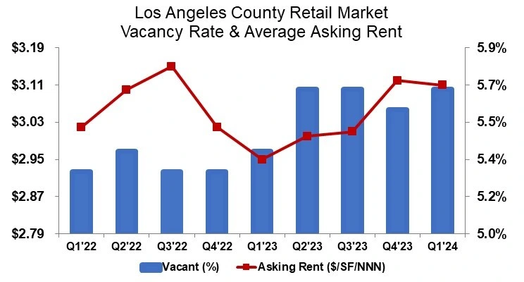 Retail은 1분기에는 소매업체가 실적이 저조한 매장을 계속 폐쇄하면서 소매업체가 오프라인 매장으로 회귀하는 데 어려움을 겪었고, 이로 인해 공실률이 5.7%로 상승했으며 평균 요구 임대료는 전 분기보다 1센트 감소하여 1분기에는 평방피트당 3.11달러로 결정되었다.