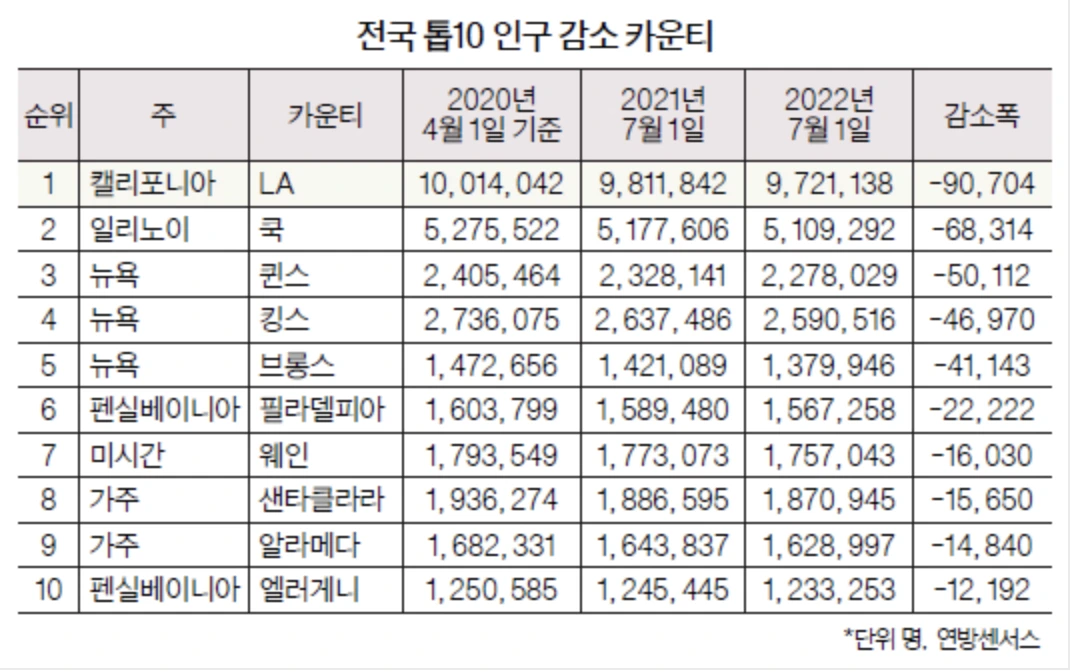 LA 카운티는 미국 내에서 가장 인구가 많은 카운티이며, 한인 역시 10.4만명(혼혈 포함 11.3만명)이 거주하는 인구수 1위 도시이다. 그런 LA의 인구수는 2020년 1,001만명에서 점차 감소하여 2022년 기준 972만명으로 미국에서 인구가 가장 빠르게 줄고 있다. LA타임스 등 현지 매체들에 의하면 LA카운티의 인구감소는 LA의 비싼 집값 등 높은 물가와 코로나19 이후 일부 지속되는 재택 근무 등에 의한 것으로 분석했다.