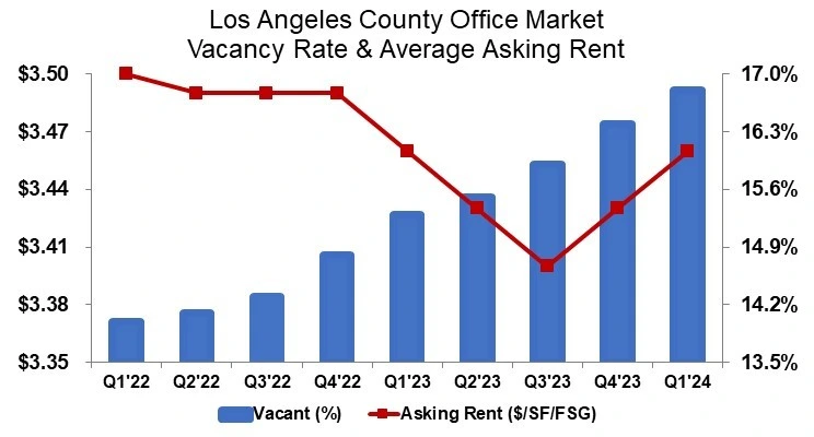 2024년 오피스 공간 시장은 기업들의 과잉 공간 해소가 계속되면서 약화된 상태로 시작됐고, 이로 인해 1분기 공실률은 16.8%로 증가했다. 평균 요구 임대료는 2023년 말 수준보다 3센트 상승하여 1년 전 풀서비스 총 평방피트당 3.46달러와 동일하게 유지되었다.
