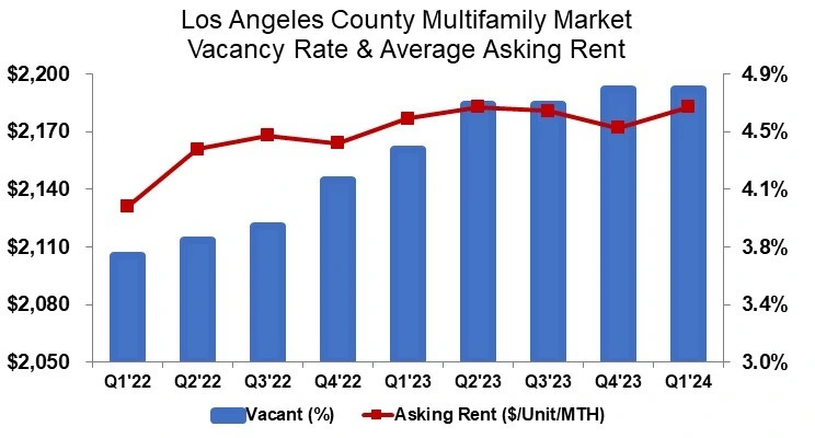 2024년 1분기 동안 LA 카운티의 상업용 부동산 시장은 다양한 부문에 걸쳐 임대료 및 매매 가격이 하락하는 동시에 공실률이 크게 증가했다. 그러나 그 중에서 유일하게 단위당 임대료와 매매가격이 상승하는 분야가 바로 Multifamlily다. 특히 고급 시장 부문 신규 공급은 유닛당 평균 요구 임대료 증가에 기여했고, LA 카운티의 평균 임대료는 월 단위당 $2,183(원화 301만원)으로 사상 최고치를 기록했다.