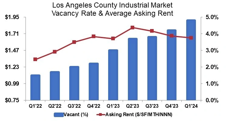 산업용 부동산의 경우 2024년 1분기 공실률은 60bp 상승한 4.8%였으며, 평균 요구 임대료는 3분기 연속 하락하여 분기 대비 1.8% 하락했으며 작년 수준보다 6/10 하락했다.