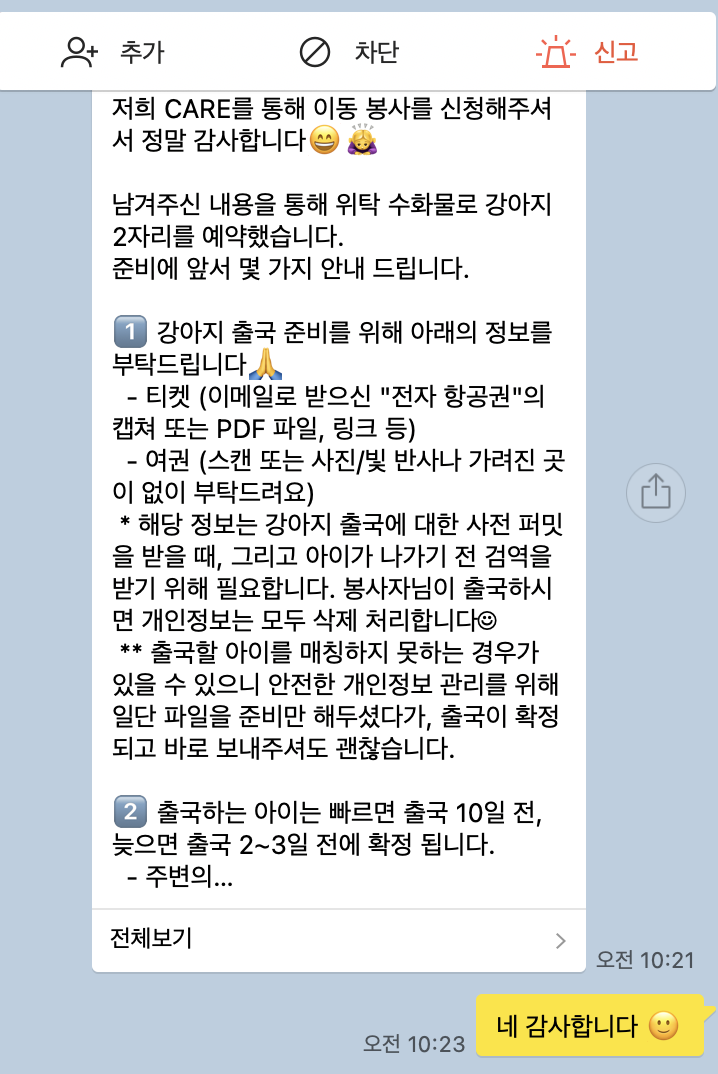 항공권, 이동수단, 숙박 예약과 유기견 해외이동봉사 신청까지