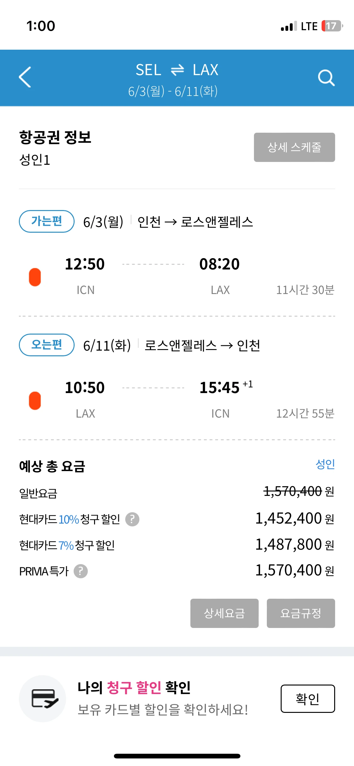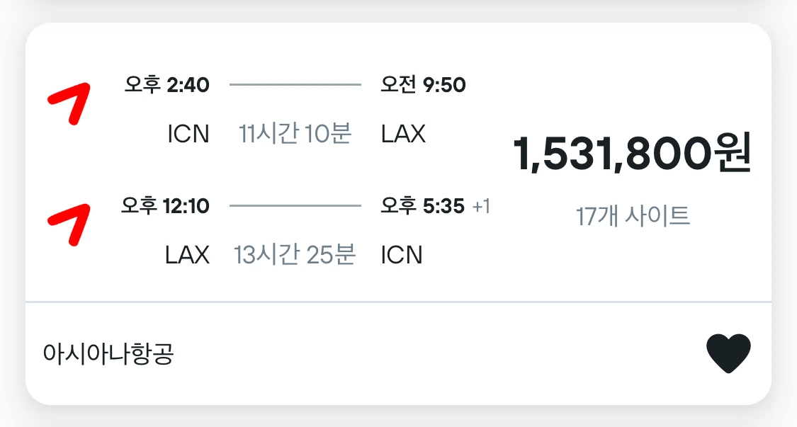 그렇게 일정을 짜고 있었는데 다시 일정이 바뀌면서 원래대로 LA만 가는 티켓을 알아보기 시작했다. 여기에서 꿀팁! 같은 일정이라도 언제 예약하는냐에 따라 항공권 가격이 다르다. 카더라통신으로는 일요일, 화요일이 가장 저렴하다고 하던데 그 때가 마침 일요일이었고, 다시 예약하려고 확인해보니 아시아나항공이 150만원대로 가격이 떨어진 것을 발견했다.