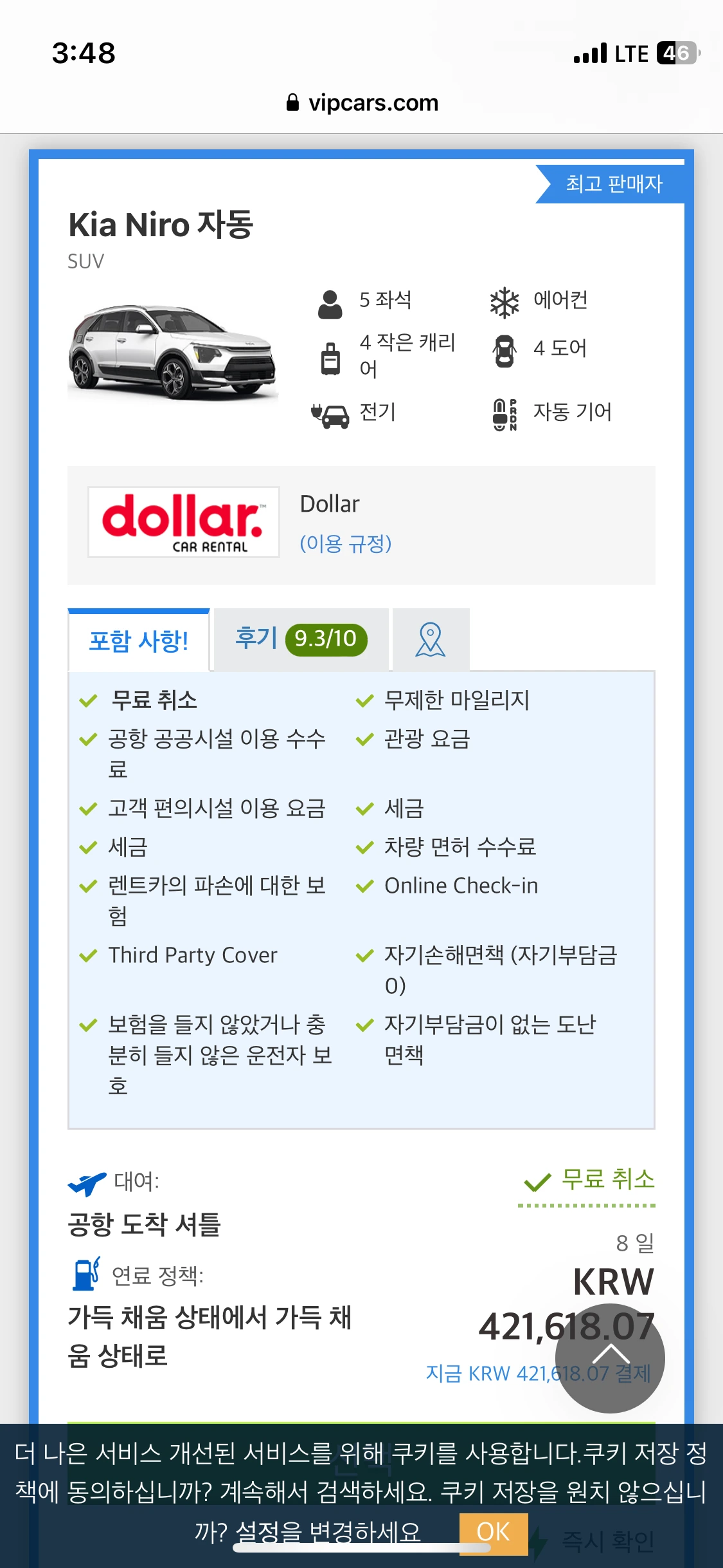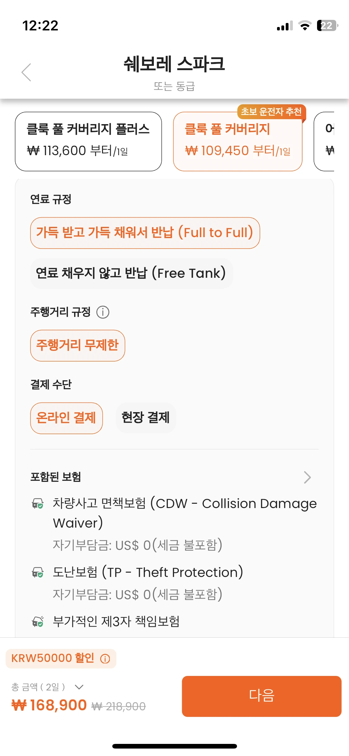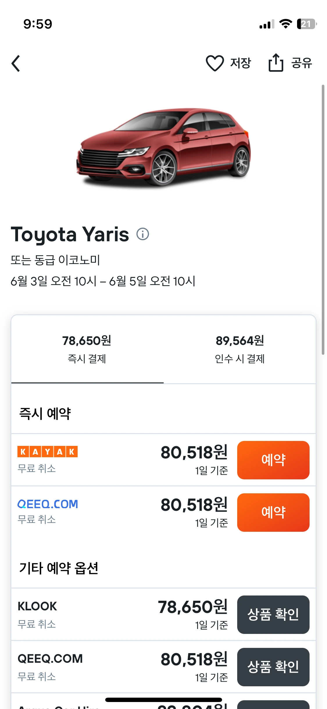 마지막 대안인 렌터카, 친언니가 최근 LA에 다녀왔는데 렌탈이 좋았다는 얘기를 듣고 바로 알아봤다. 대여 기간이 길면 요금이 더 저렴해지는 것 같긴 한데 나는 일단 혼자 여행하는 첫 이틀만 렌탈을 하고 이후엔 친구랑 의논해보기로 해서 2박 3일만 예약했다. 만 이틀 꼬박해서 16만원+풀커버리지보험 하면 20만원(1일 10만원 꼴)이 조금 넘었는데 KLOOK에서 미국렌터카 5만원 할인이벤트하길래 재빨리 예약했다. 요런 소소한 할인받는 재미로 손품파는거 아니겠어요?