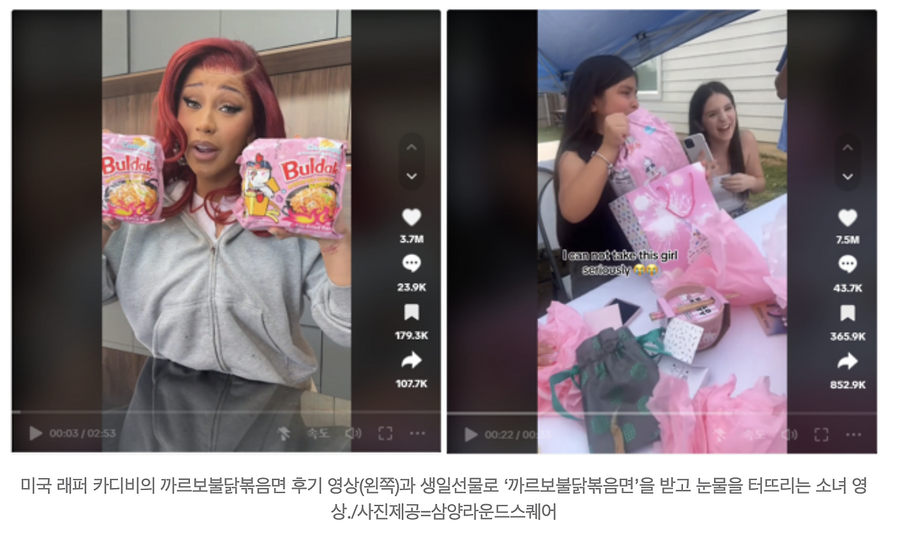 미국 래퍼 카디비가 30분동안 운전해서 까르보불닭볶음면을 구했다며 먹는 영상을 틱톡에 올리고