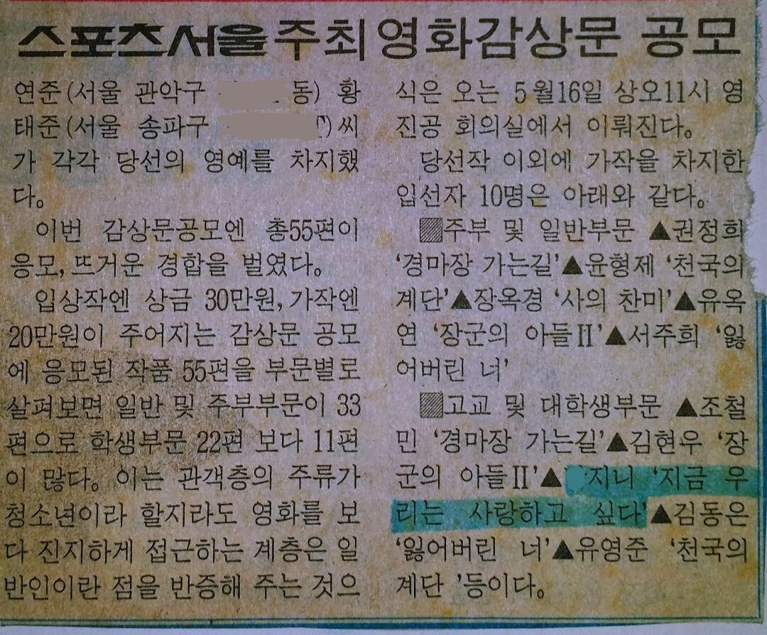 아무튼, 엄마가 어느 날 스포츠 신문에서 영화감상문 공모 기사를 오려와 나에게 전해주며 말씀하셨다.