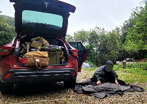 어찌어찌 캠핑장으로 향했다. 친구는 비 오는 초행길을 와봤던 사람처럼 운전도 잘했다. 친구는 비옷을 떡하니, 내 것까지ㅡ물론, 원 주인은 증상이 좀 호전되시면 같이 오려던 어머님 비옷이었지만ㅡ 준비해 내어 줄 때부터 유튜브 보고 배운 캠핑내공을 보여주기 시작했다.