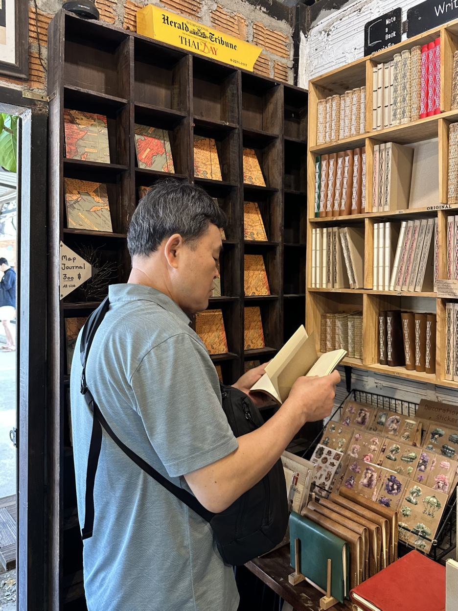 치앙마이에서 가장 가보고 싶었던 예술가들의 거리 ‘반캉왓’은 부모님이 오시면 함께 가려고 아껴 두었던 곳이었다. 아기자기하면서 개성과 매력이 넘치는 작은 가게들이 줄지어 마을을 형성하고 있어서 각자 취향에 맞게 구경하기 딱 좋았다. 아이들은 물감으로 색칠하는 체험을 해보기도 하고, 친정아빠는 노트 가게에서 여행기를 작성할 공책을 하나 구입하셨다. 부모님 두 분이서 캐리커처도 했는데, 결과물을 받아 들고 아빠는 좋아하셨고 엄마는 마음에 들어 하지 않으셨다. 나중에 친정집에 가보니 아빠가 어디선가 액자를 구해 오셔서 두 분의 캐리커처를 넣어 거실장에 전시해 놓으셨더라.