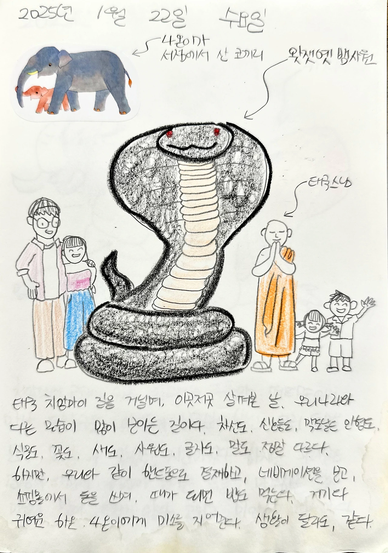 치앙마이에서 집으로 돌아온 뒤, 네 가족이 둘러앉아 여행의 의미에 대해 이야기 나눈 적이 있다. 아이들은 두 눈을 크게 뜨고 한참을 고민하더니 첫째는 코끼리도 만나고 예쁜 풍경을 실컷 봐서 최고였다고 답했고, 둘째는 그냥 ‘예쁜 것’이라고 했다. 그리고 남편은 ‘아내가 좋아해서 좋았다.’고 말한다. 우리 남편한테는 아내가 좋은 게 좋은 거라고 생각하니 괜히 코끝이 찡하면서 그 마음이 고맙다. 그래도 나 말고 온전히 자신만 놓고 봤을 때 여행은 어떤 의미냐고 다시 물어보니 ’직접 경험‘할 수 있는 게 좋다고 한다. 남편에게 여행은 책에서 본 여러 궁금한 것들을 직접 보고 만져보고 체험해 보는 흥미롭고 재밌는 일인 것이다. 그래서인지 여행을 떠나자고 제안했던 나보다 여행 내내 다양한 것들에 더 신기해하며 호기심 가득한 눈빛을 보내줬던 남편이었다. 같은 여행을 떠나도 여행의 의미는 사람마다 다를 수 있다는 것도 알게 되었다. 문득 다른 사람들의 여행에는 또 어떤 의미들이 있을지 궁금해지기도 한다.