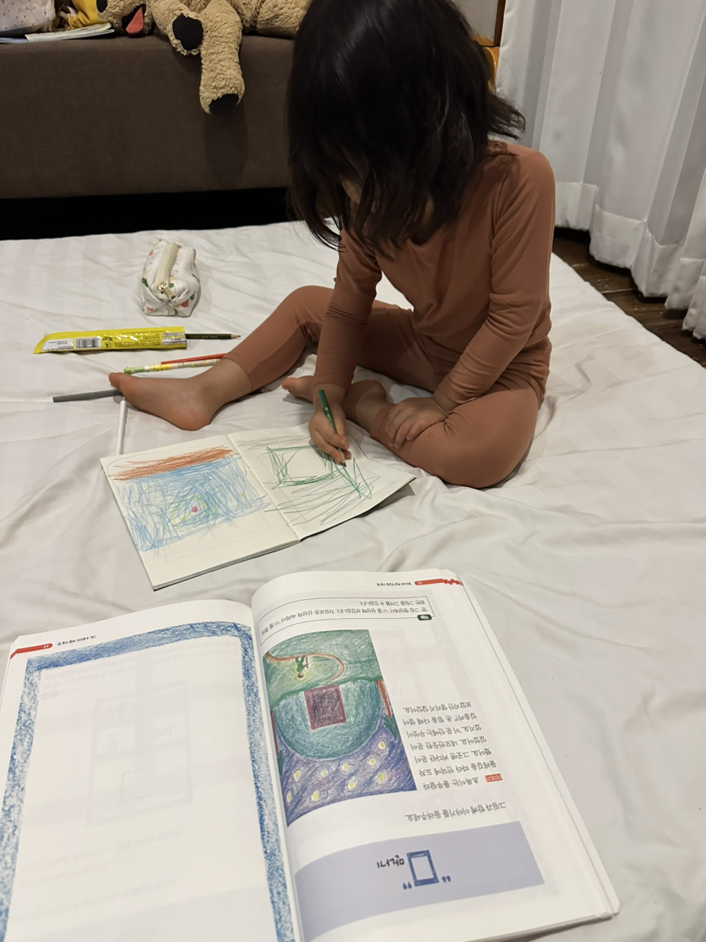 그 외에도 그림일기와 자기 전 책 읽어주기, 요가 수련과 운동을 이어간 이야기는 다음 기회에 글로 정리해 봐야겠다. 생각해 보면, 아이들과의 해외여행을 최대한 미루고 싶었던 나는 결국 다녀왔고, 미루고 싶었던 한글 공부도 시작해 버렸다. 모순적인 엄마의 변명글처럼 되어버렸지만 이렇게나 고민하고 흔들렸기 때문에 우리의 여행이 조금 더 단단해졌고 더 의미 있어졌다고, 그렇게 믿어 본다.