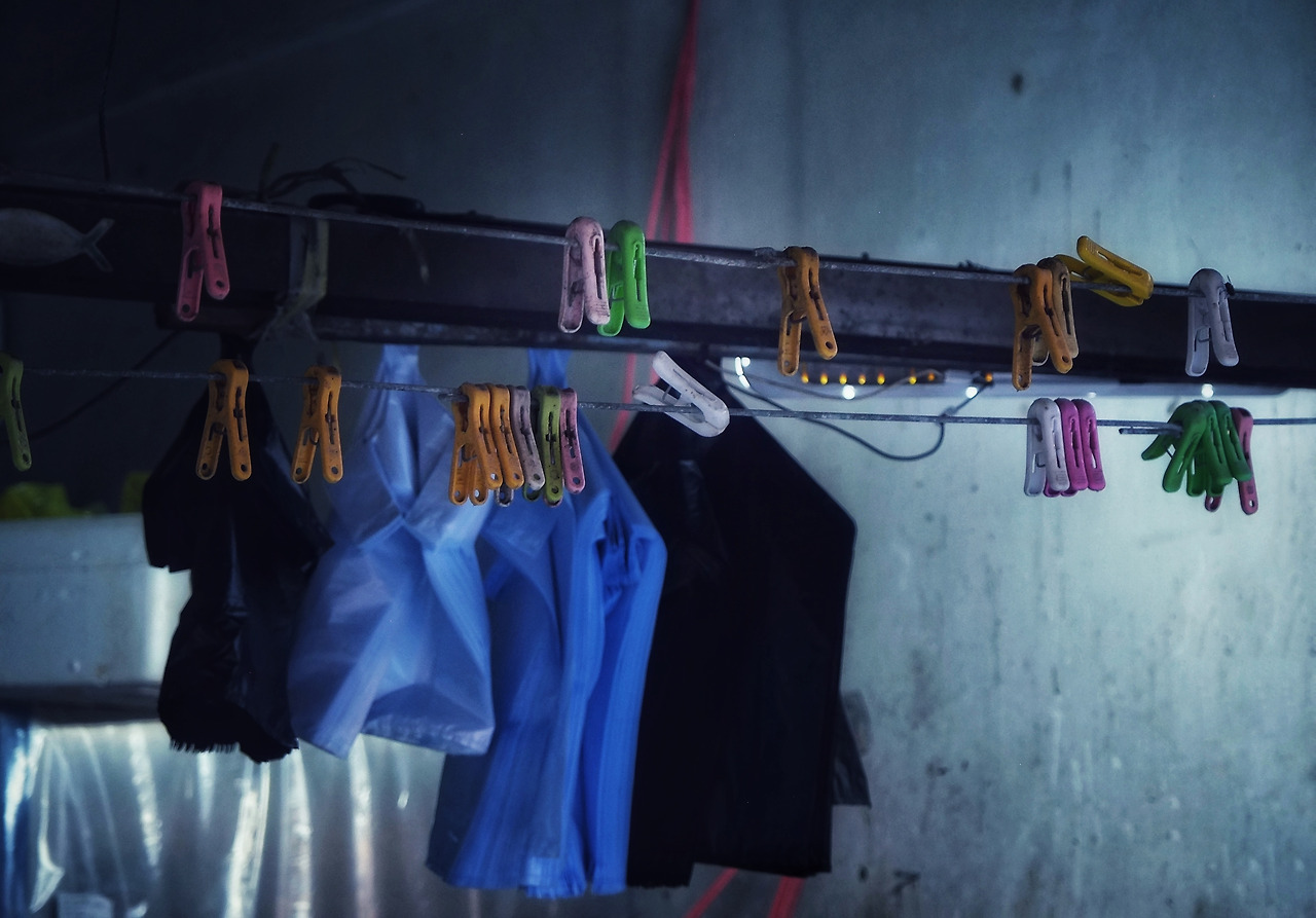 할머니는 밑에서 물을 받아 뿌리고 다시 빈통을 올려 보낸다.
