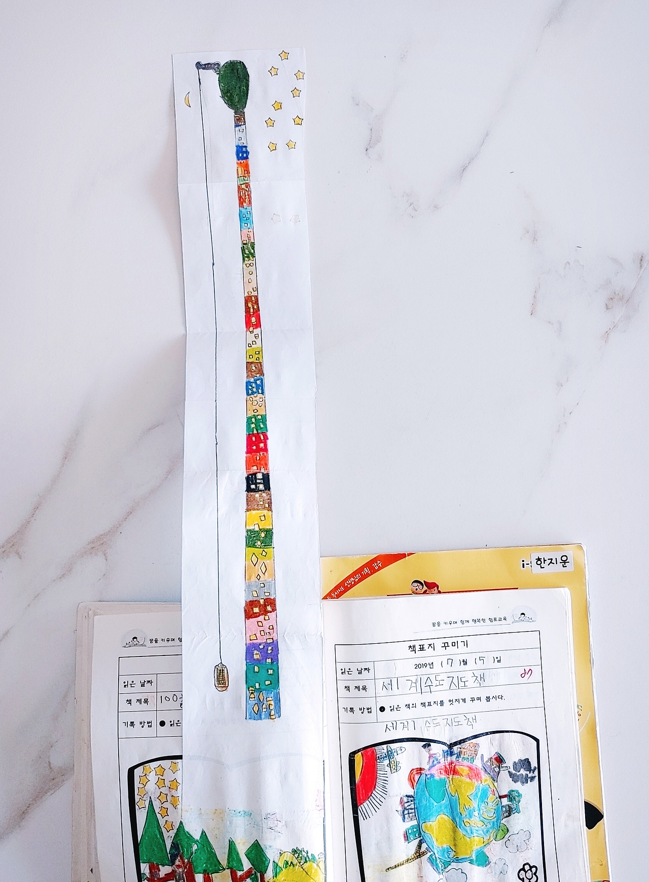 둘째 아이는 [100층짜리 집]을 읽고 누나의 독서기록장에서 힌트를 얻어 A4 종이를 덧대 길고도 긴 100층짜리 집을 표현했다. 우리 집 둘째는 누나 바라기라 누나가 했던 건 무엇이든 따라 해보려 한다. 이럴 땐 누나가 엄마보다 좋은 선생님이 되어 준다.