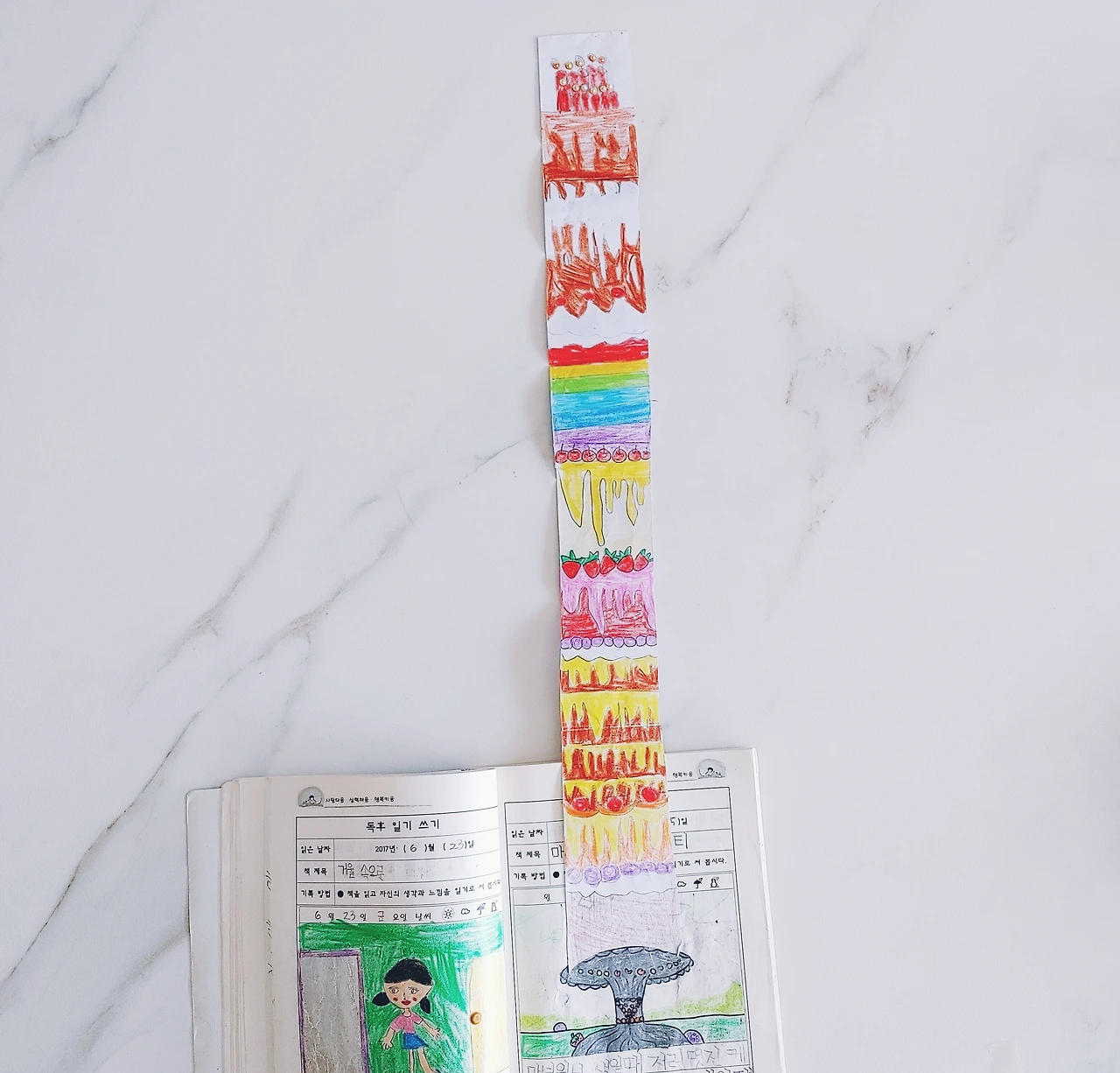 첫째 아이는 [마녀 위니의 생일 파티]를 읽고 키 큰 케이크를 표현하고 싶어 A4 종이를 덧대 길고도 긴 세상에 하나뿐인 케이크를 표현했다. 긴 케이크를 접었다 펼치면 마법처럼 맛있는 케이크로 변신한다. 그림을 그린 후, 자신의 생일에도 멋진 케이크를 만들고 싶다고 속마음을 남기기도해서 아이의 독서기록장이 가끔은 아이의 마음을 읽을 수 있는 일기장이 되곤 한다.
