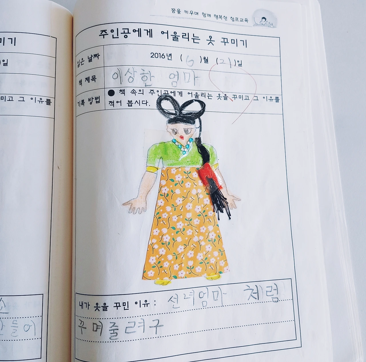 [이상한 엄마]를 읽은 첫째 아이는 선녀의 머리카락을 표현하기 위해 검은 실이 필요하다며 서랍장에서 실을 꺼내와 선녀 얼굴에 맞게 예쁘게 커트도 해준다. 한복은 꽃무늬 모양 색종이와 반짝이 보석 스티커로 맘껏 꾸며주어 선녀 엄마의 스타일리스트가 되기도 한다. 책에 나온 엄마보다 더 예쁜 엄마가 탄생되는 순간이다.