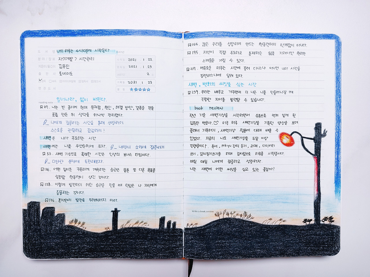표지를 그리기도 하고 마음에 드는 장면을 그리며 나만의 독서기록을 만들어 가는 재미 덕분에 잡념을 잊은 채 그 시간만큼은 집중할 수 있었다.