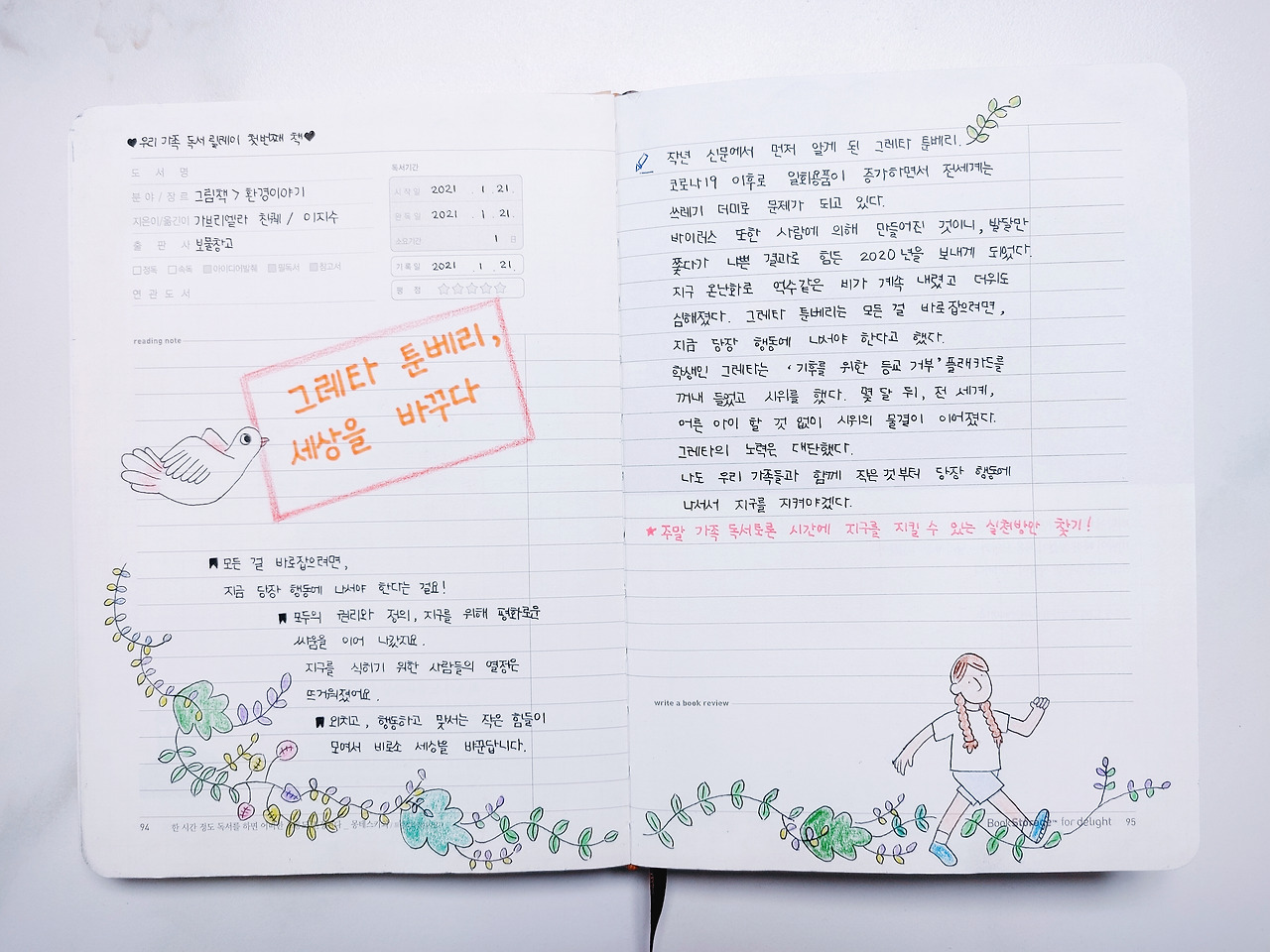 읽은 내용을 기록하다 아이들이 그림으로 표현하는 독후활동을 하는 날엔나도 아이가 쓰던 색연필을 꺼내 그림을 그리고 색칠도 하며 생기 가득한 독서기록을 하였다.