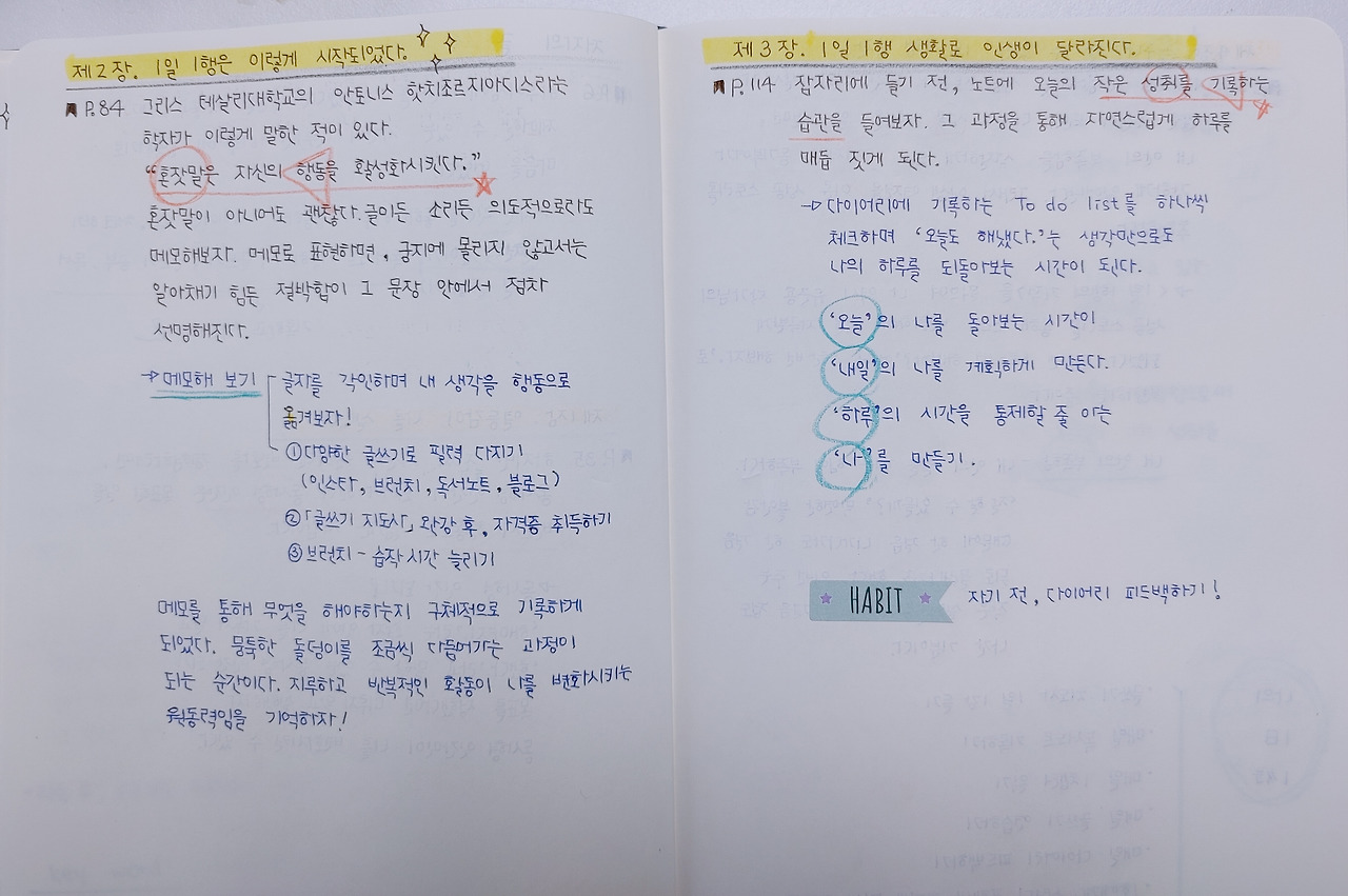 최근엔 책의 스토리를 기억하기 위해 한 챕터씩 읽고 기록하는 중이다. 한 챕터에서 가장 마음에 드는 문장을 기록하고 내가 실행할 수 있는 것들을 찾아 실천하는 실천 독서 중심의 독서를 하고 있다. 나와의 약속을 지키기 위해 실행력을 발휘할 수 있어 도움이 되는 독후활동 중 하나이다.