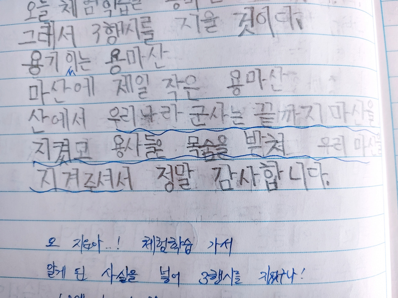3학년 사회 시간에 학습한 내용으로 지은 3행시거실 책장 한 켠에는 아이들의 일기장이 꽂혀있다.
