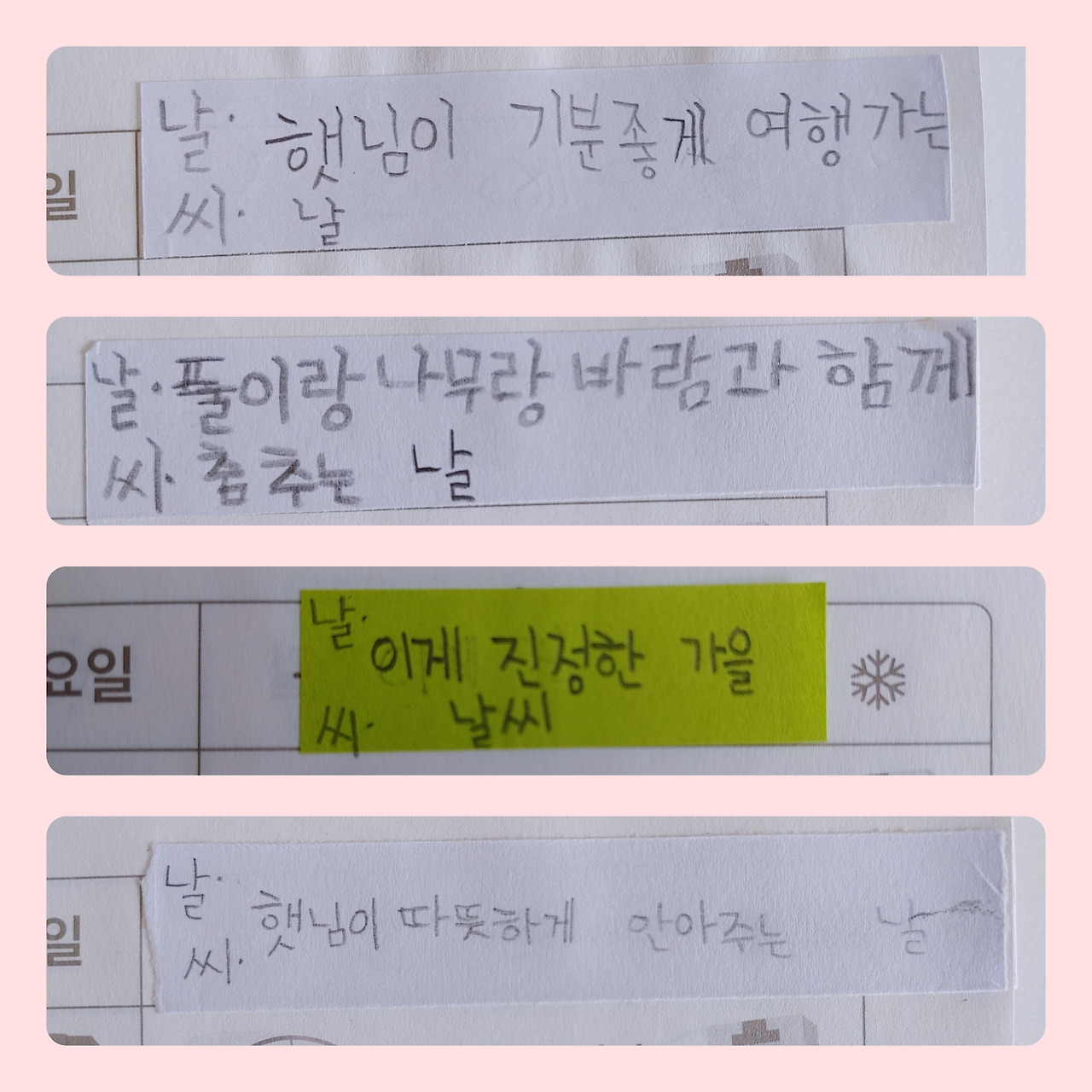 초등학교 1학년 때부터 일기장에 프린트된 똑같은 날씨 그림에 동그라미로 체크 하기보다 자기 생각을 표현하기를 좋아했다. 오늘의 날씨에 떠오르는 단어와 느낌을