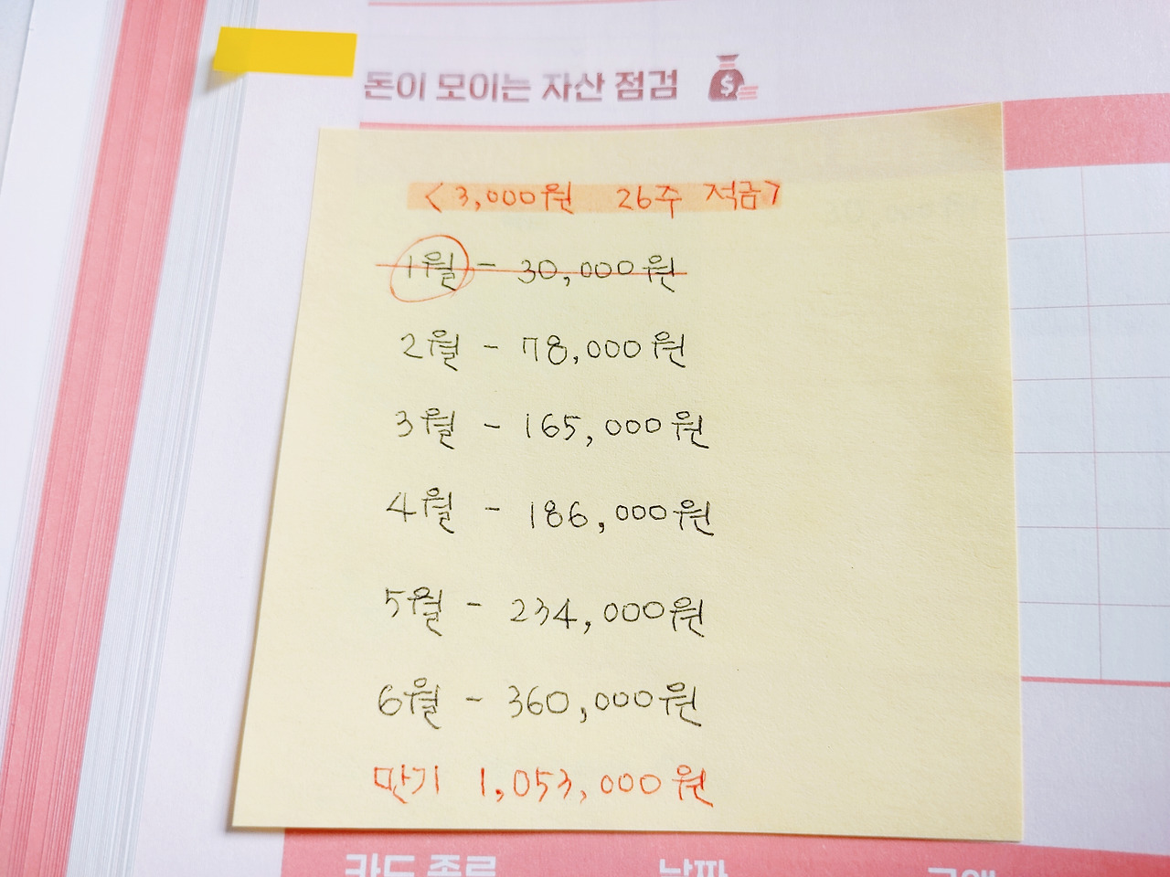 새로 구입한 가계부를 보며 매달 마지막 결산 페이지에 <돈이 모이는 자산점검> 칸이 보였다. 보는 순간 딱 하나가 떠올랐다. <26주 적금>